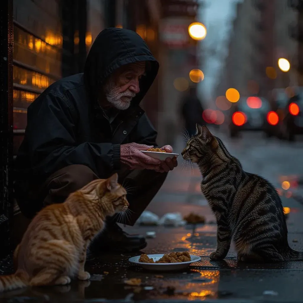 Generate award-winning AI imagery of a homeless man's selfless act—sharing food with stray animals. Explore empathy in adversity with vivago.ai's AI photo effects & editing tools for poignant, professional visual storytelling.