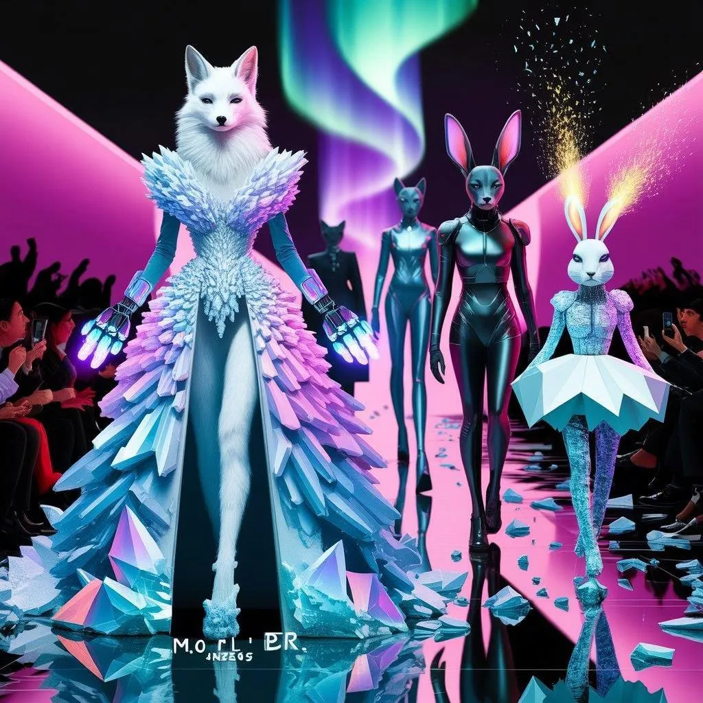 Experience a surreal AI-generated haute couture spectacle where cybernetic arctic foxes shimmer in fractal ice gowns, panthers drip liquid-metal smoke suits, and levitating origami rabbits trail bioluminescent pollen. Glitching neon vines frame prismatic runways as chameleons broadcast CCTV skin and raccoons juggle flaming credit cards. Discover Vivago.ai’s creative AI tools for transforming wild concepts into hyper-detailed masterpieces with toxic lime, space-purple, and molten silver palettes.