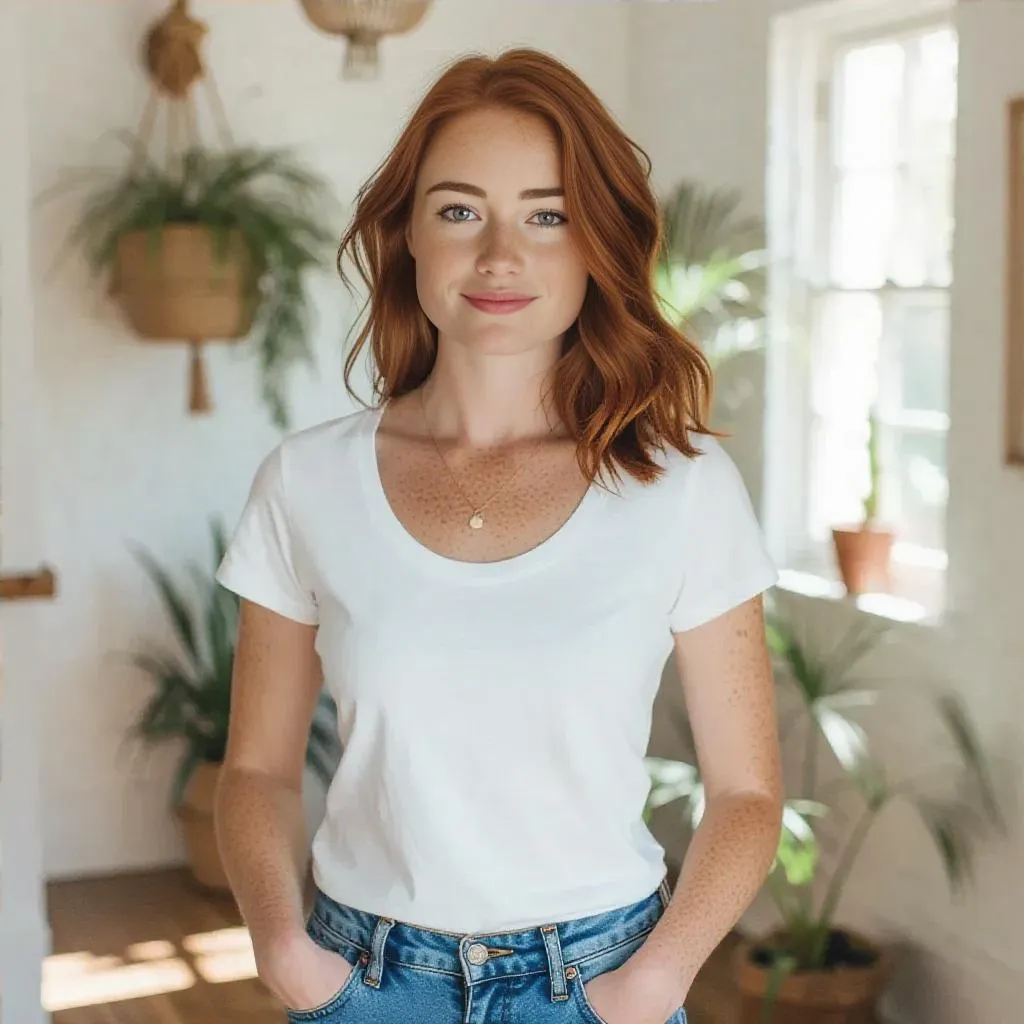 Generate a British girl in her 20s AI image with light red shoulder-length hair & partial fringe. Features: blue-green eyes, visible freckles on face/arms/body, elegant neck, small breasts, happy expression, long legs. Wears a casual white tshirt and blue jeans. Create vibrant AI portraits at VivaGo.