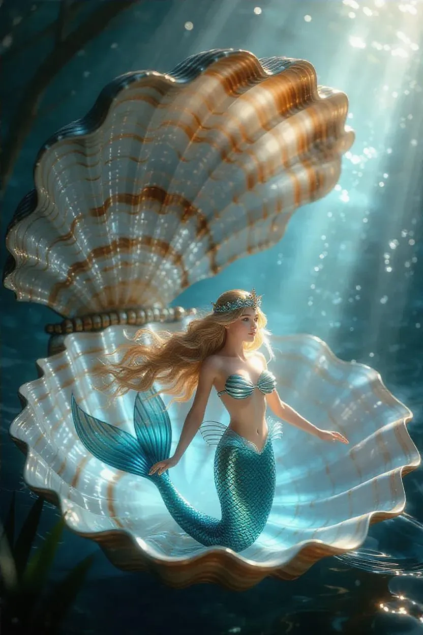 Discover AI-generated visuals of a serene mermaid in a fantasy ocean within a half-opened pearl shell. High-resolution artwork featuring silvery fins, flowing blonde hair, and braided crowns. Transform text prompts into immersive worlds with Vivgo.ai's advanced text-to-image AI for stunning, professional-grade fantasy art and creative storytelling.