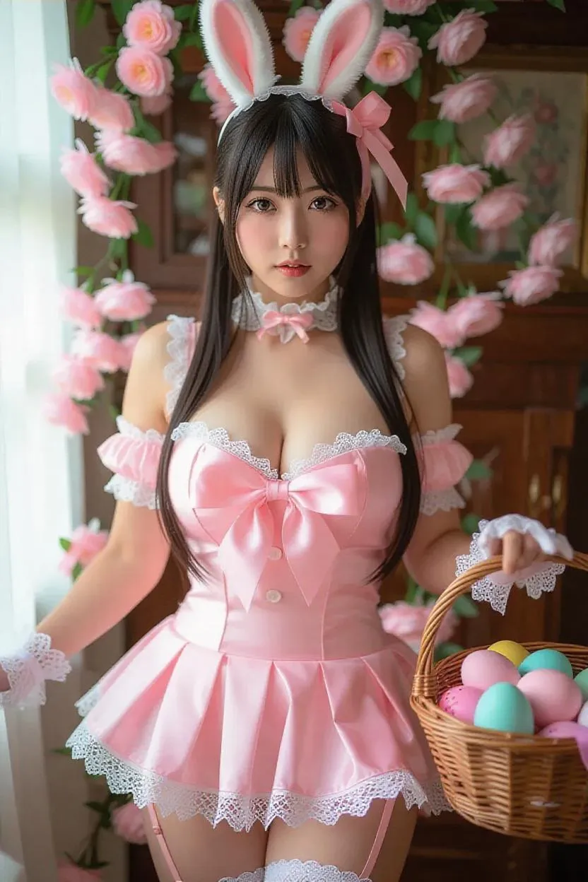 A sultry Tifa Lockhart, dressed in an easter dress with a pink bow on the sash, bunny ears, white pantyhose, makeup, easter basket