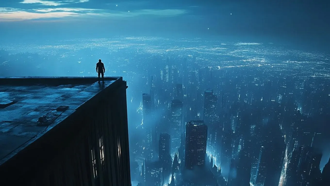 Experience a cinematic high-angle shot with AI-powered hyperrealism. Capture a lone figure on a skyscraper ledge, dwarfed by a vast glowing cityscape merging into mist and stars. Ultra-wide lens amplifies scale, while Hollywood-style lighting casts dramatic shadows, crafting an emotionally charged finale. #Realistic, Hyperrealism, Hollywood-Style, Cinematic