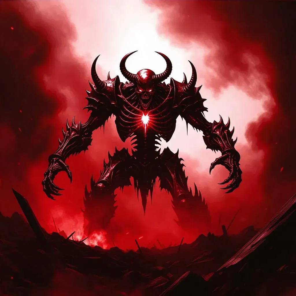 Insatiable Fury Abomination with bone-white and crimson-red color palette, towering over a desolate battlefield, eyes glowing with malevolent energy, jagged bones protruding from its skin, surrounded by swirling dark mist, creating a haunting and foreboding atmosphere.