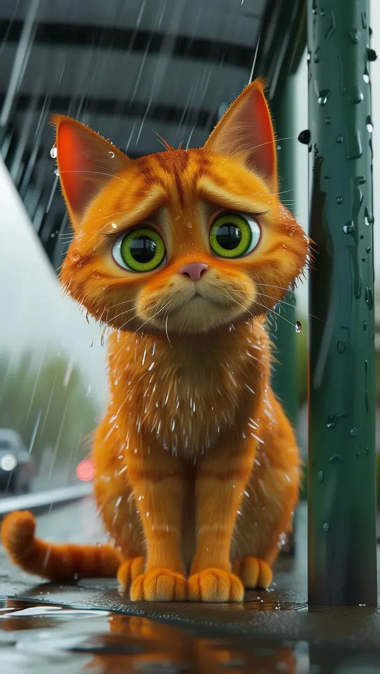 Create a vivid 3D cartoon animation of a soaked orange tabby cat with tired greenish-yellow eyes, shivering under a bus stop shelter during a heavy downpour. Perfect for AI-generated visuals, transform text prompts into lifelike animations with emotional depth. Ideal for storytellers, designers, and creators seeking professional-grade, atmospheric scenes. Explore AI effects to bring rainy-day narratives to life.