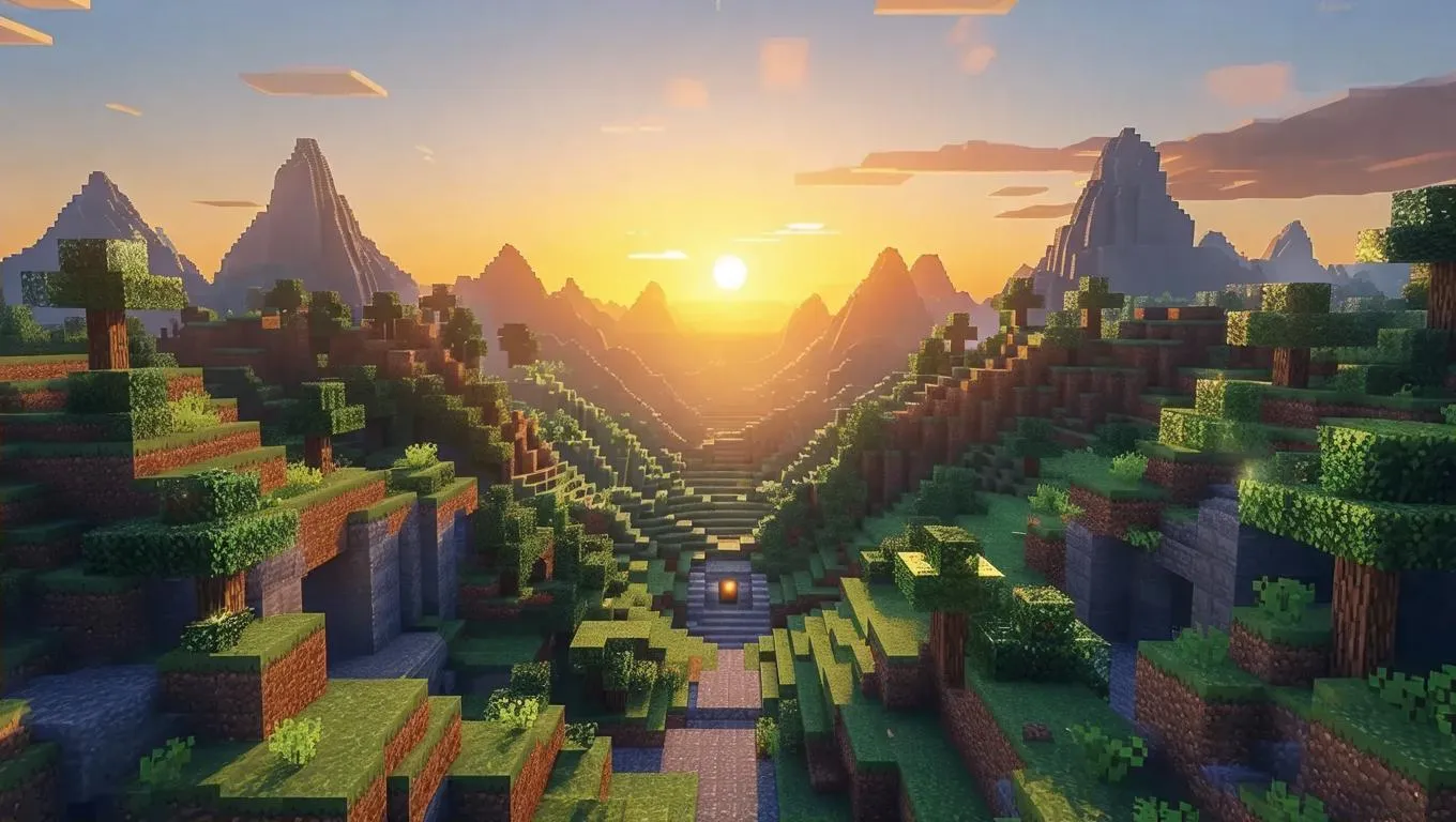 A pixelated, blocky landscape of Minecraft realism, with towering mountains, sprawling forests, and intricate underground tunnels. The scene is bathed in a warm, sunset glow, casting long shadows and creating a sense of depth and immersion. The pixel art style is meticulously detailed, showcasing the unique charm of this iconic game world.