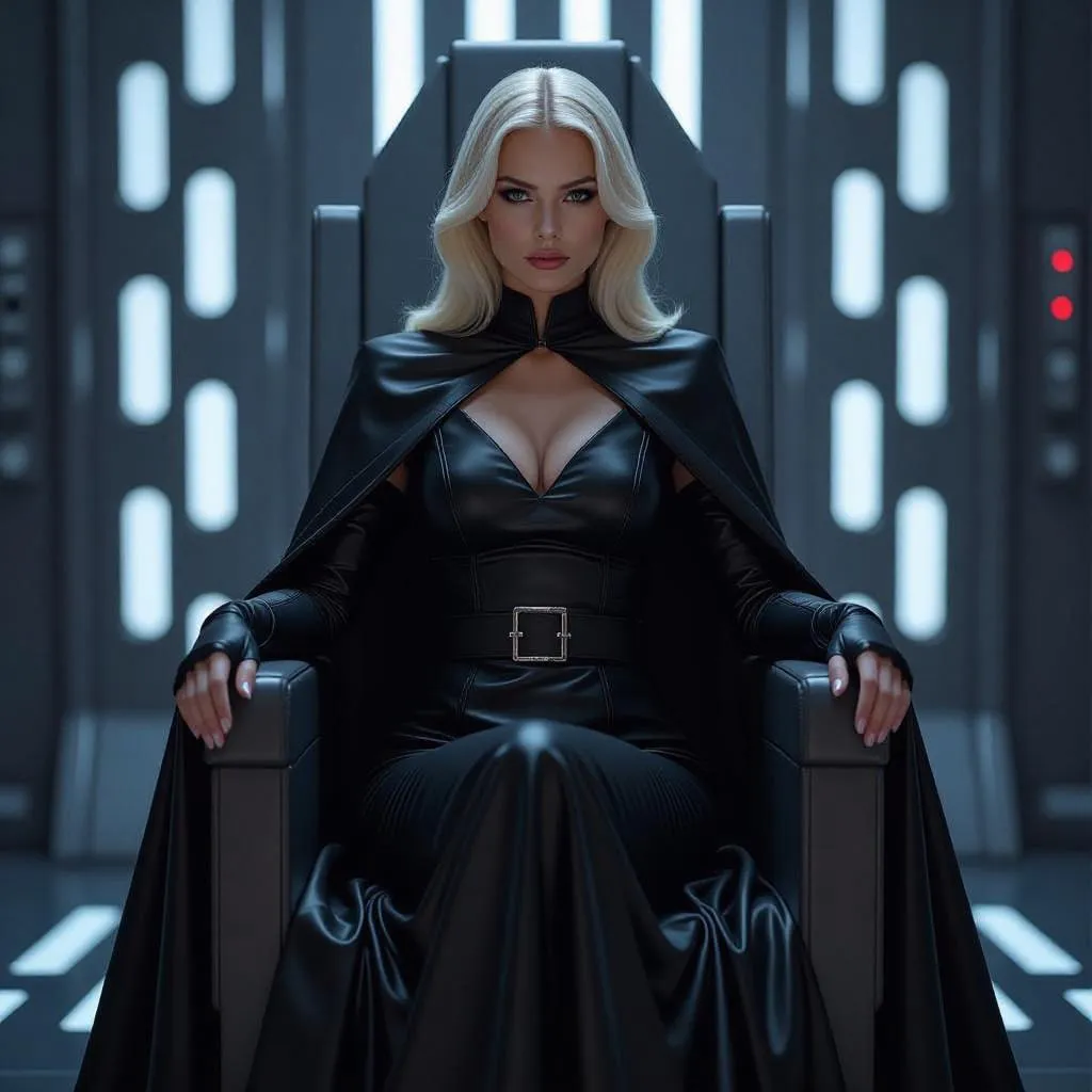 photorealistic of a mid twentys blonde sith wearing a leather black gown and a tight tall cape on her throne on the death star