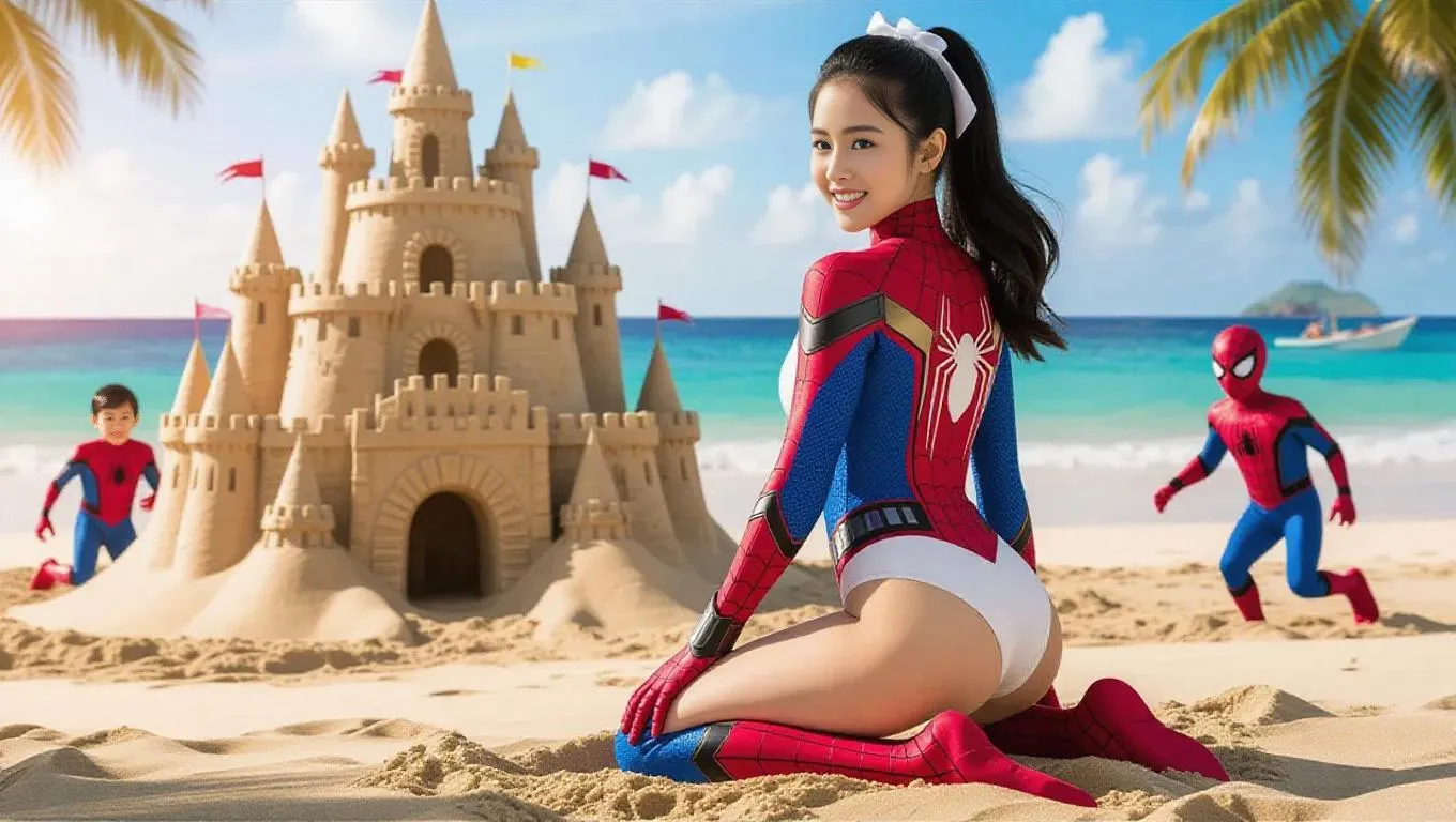 Spiderman and a beautiful Japanese woman in her 20s, wearing a white bikini, kneels on a tropical beach. Her back and hips face the camera, smiling brightly as she turns her head slightly over her shoulder. Long black hair in a high ponytail with a white ribbon. Focus on her smooth back, curved hips, and cheerful expression. Large, intricately detailed sand castle with turrets, arches, and carved textures casting soft shadows on the golden sand. Castle newly built, slightly damp, glistening in the midday sun. Baby boy and girl in Spiderman suits running nearby. Sparkling ocean, swaying palm trees, soft clouds, warm natural light. Cinematic, realistic, joyful scene. Ultra-realistic style, photo-quality textures, high detail, 4K resolution.