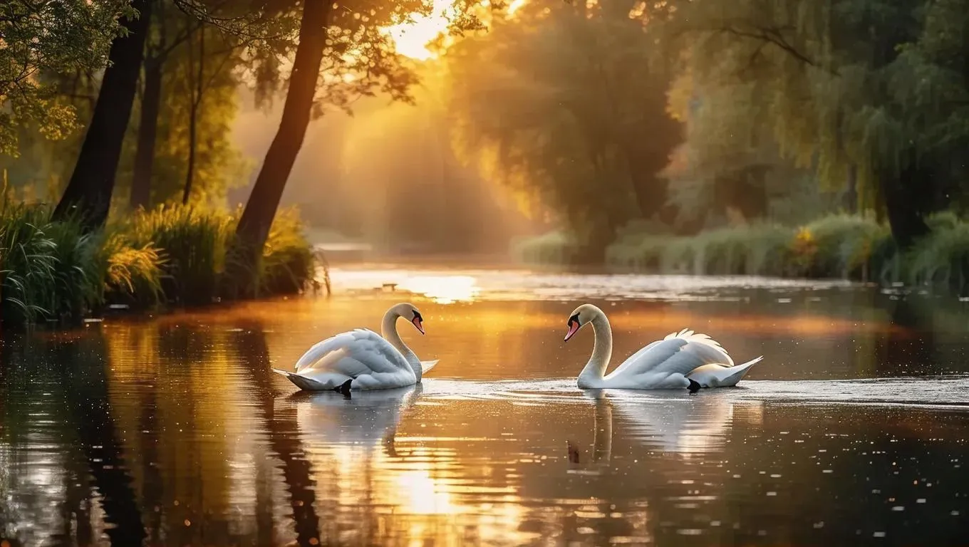 Generate stunning AI visuals of serene riverscapes with elegant white swans, lush greenery, and golden hour sunlight. Perfect for nature-inspired digital art, photography projects, or calming scenery designs using advanced AI image tools for professional-grade results.