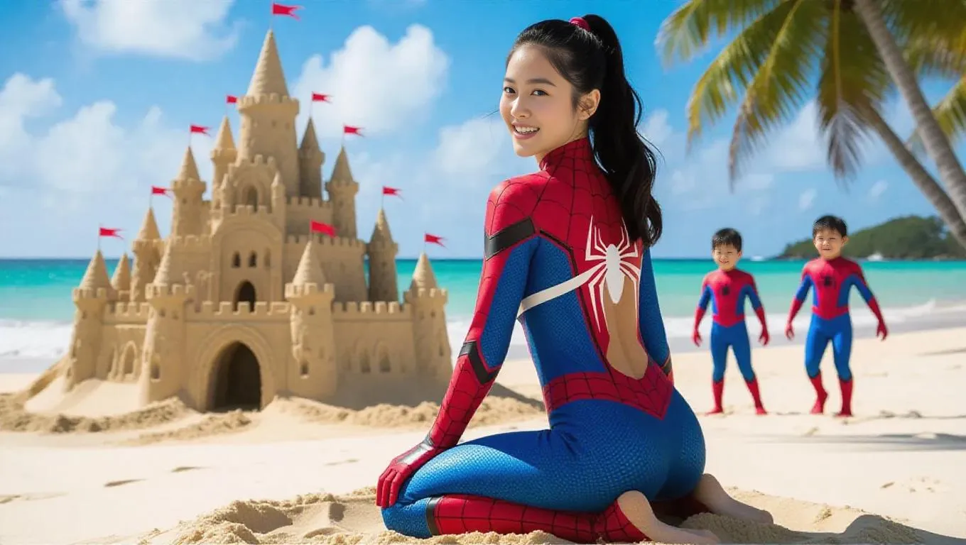 Spiderman and a beautiful Japanese woman in her 20s, wearing a white bikini, kneels on a tropical beach. Her back and hips face the camera, smiling brightly as she turns her head slightly over her shoulder. Long black hair in a high ponytail with a white ribbon. Focus on her smooth back, curved hips, and cheerful expression. Large, intricately detailed sand castle with turrets, arches, and carved textures casting soft shadows on the golden sand. Castle newly built, slightly damp, glistening in the midday sun. Baby boy and girl in Spiderman suits running nearby. Sparkling ocean, swaying palm trees, soft clouds, warm natural light. Cinematic, realistic, joyful scene. Ultra-realistic style, photo-quality textures, high detail, 4K resolution.