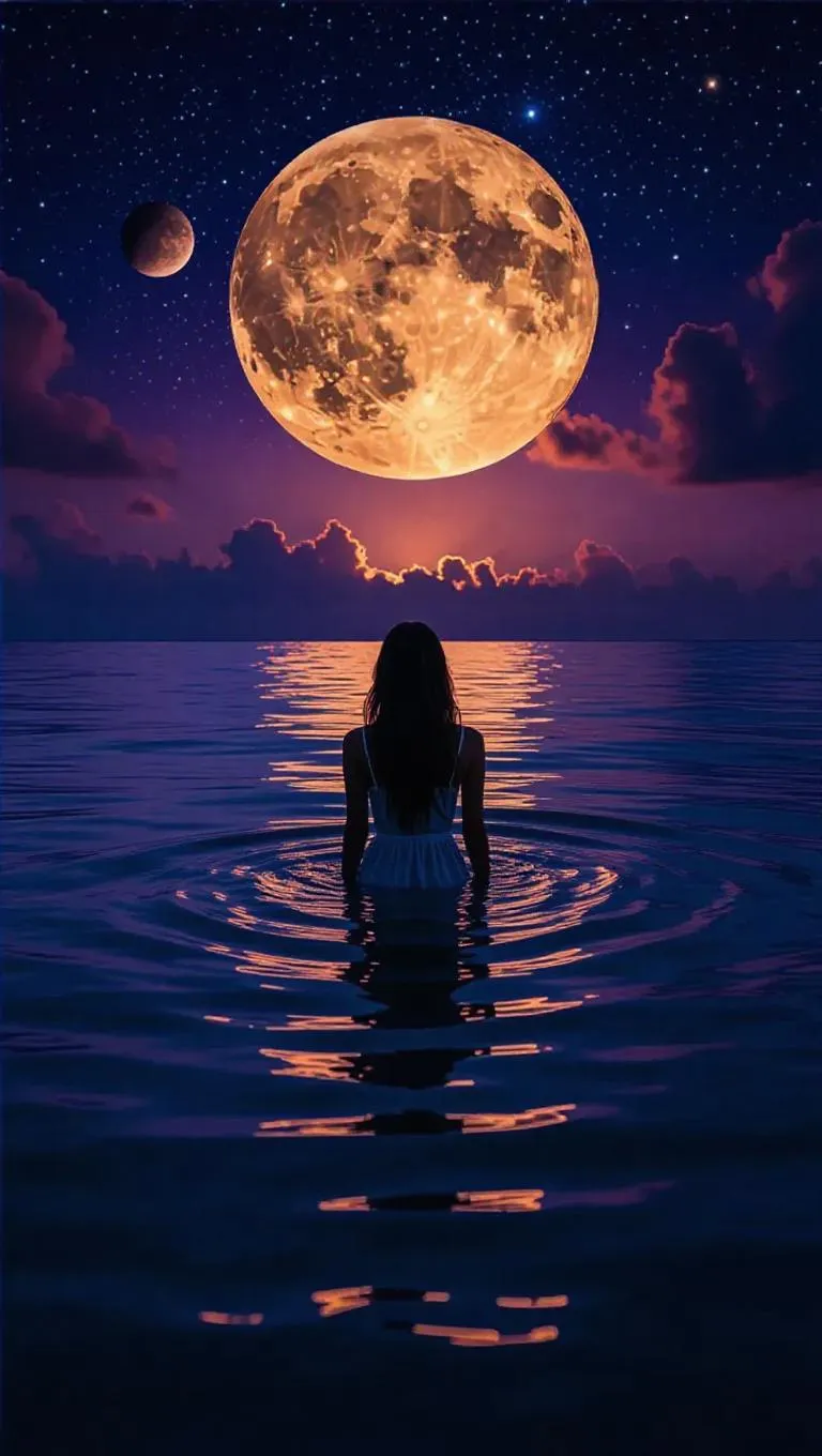 Experience AI-generated cosmic art with a serene ocean scene featuring a contemplative woman under a mystical moonlit sky. Ethereal celestial imagery blends deep blues, purples, and golden hues for a captivating, otherworldly ambiance. Perfect for cosmic-inspired visuals, AI art, or mystical digital landscapes.