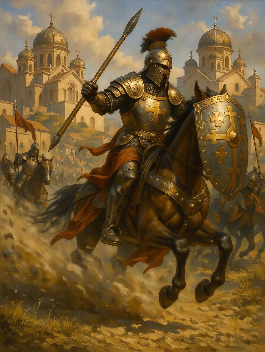Byzantine cataphract warrior charges on horseback in cinematic AI art, clad in ornate scalemail and Arab-inspired helmet. Dynamic medieval joust scene with golden-cross shield, sunlit basilica domes, and oil-painting textures. Epic motion blur, radiant lighting, and engraved armor details. AI-generated historical battle imagery blending cinematic realism and painterly drama for vivid warrior portraits.