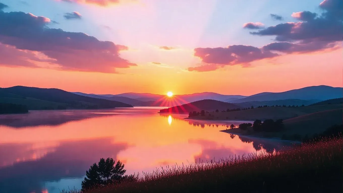 Capture a serene sunrise with vibrant orange, pink, and gold hues illuminating rolling hills or calm waters. AI blends realism and impressionism for ethereal skies, soft diffused lighting, and rule-of-thirds composition. Enhance reflections, glowing atmospheres, and balanced horizons for a tranquil, visually stunning landscape. Ideal for professional-grade AI-generated sunrises.