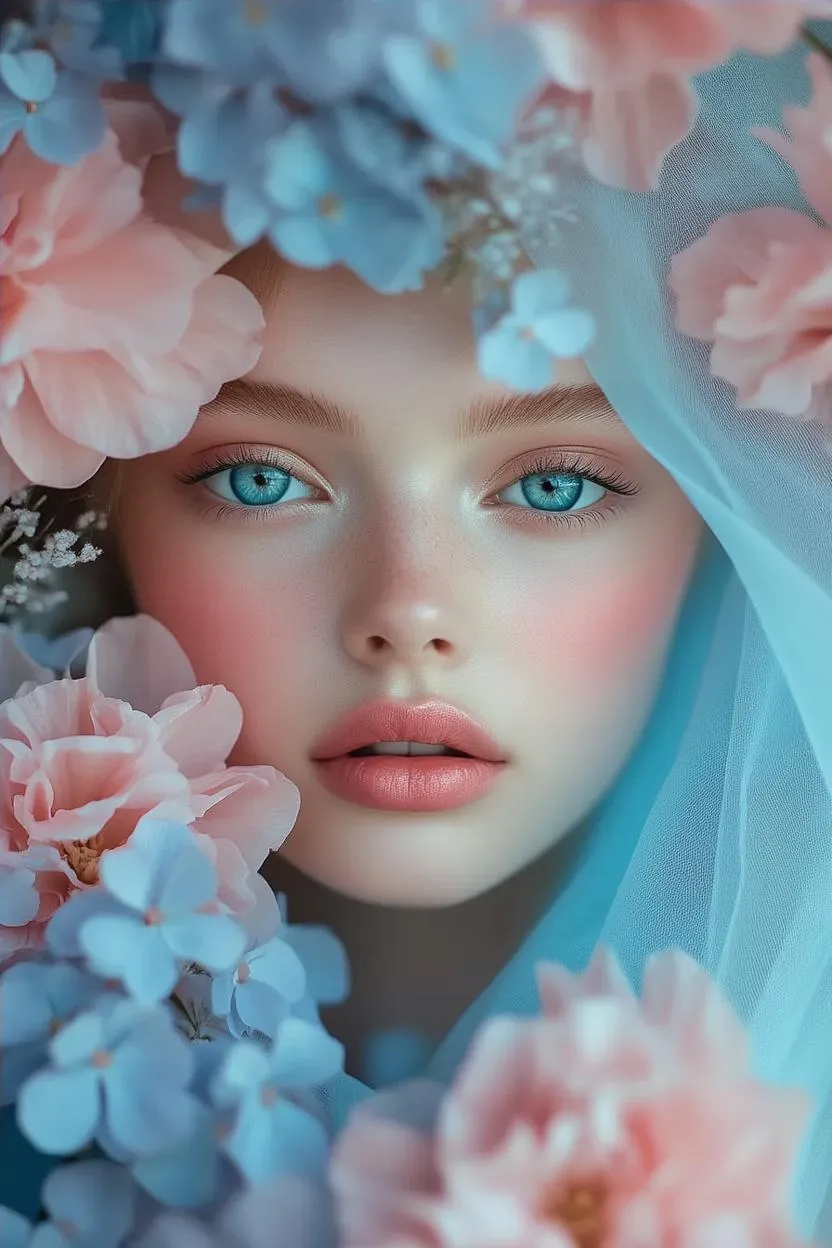 Create ethereal AI portraits with bluish-pink flowers and light blue veils using VivaGo's AI image generator. Craft artistic, stylized visuals in pastel tones for fashion photography, magazine covers, and fairy-tale illustrations. Generate professional-grade ethereal imagery with delicate makeup and dreamy aesthetics.