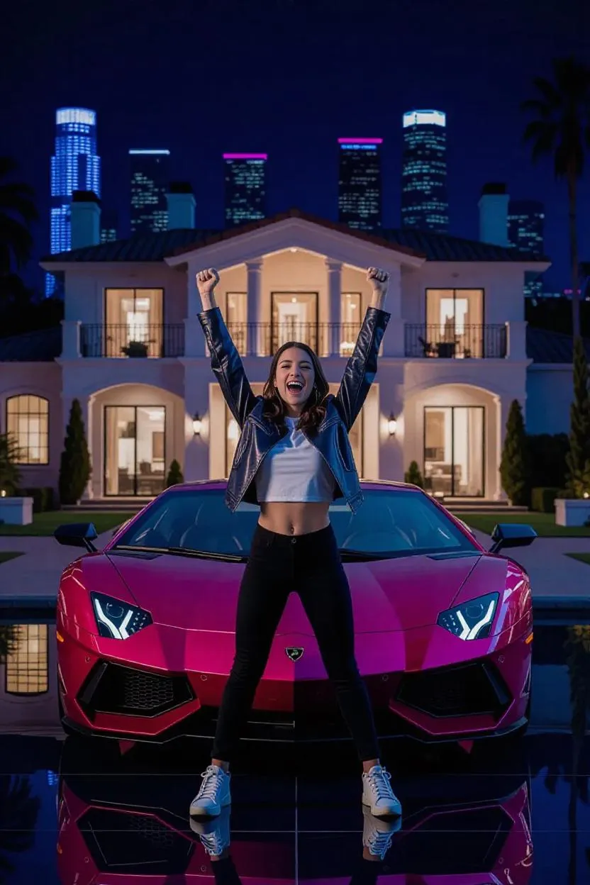 A triumphant GTA-style moment: a stylish young person standing proudly in front of a luxury sports car parked by a modern Beverly Hills-style mansion, raising both fists high in the air in celebration, neon-lit city skyline in the background, reflections on the polished car, pure joy, freedom, and pride, cinematic night scene, ultra-detailed, Polyart model, portrait 2:3, dynamic lighting, urban flair, high contrast, vibrant colors.