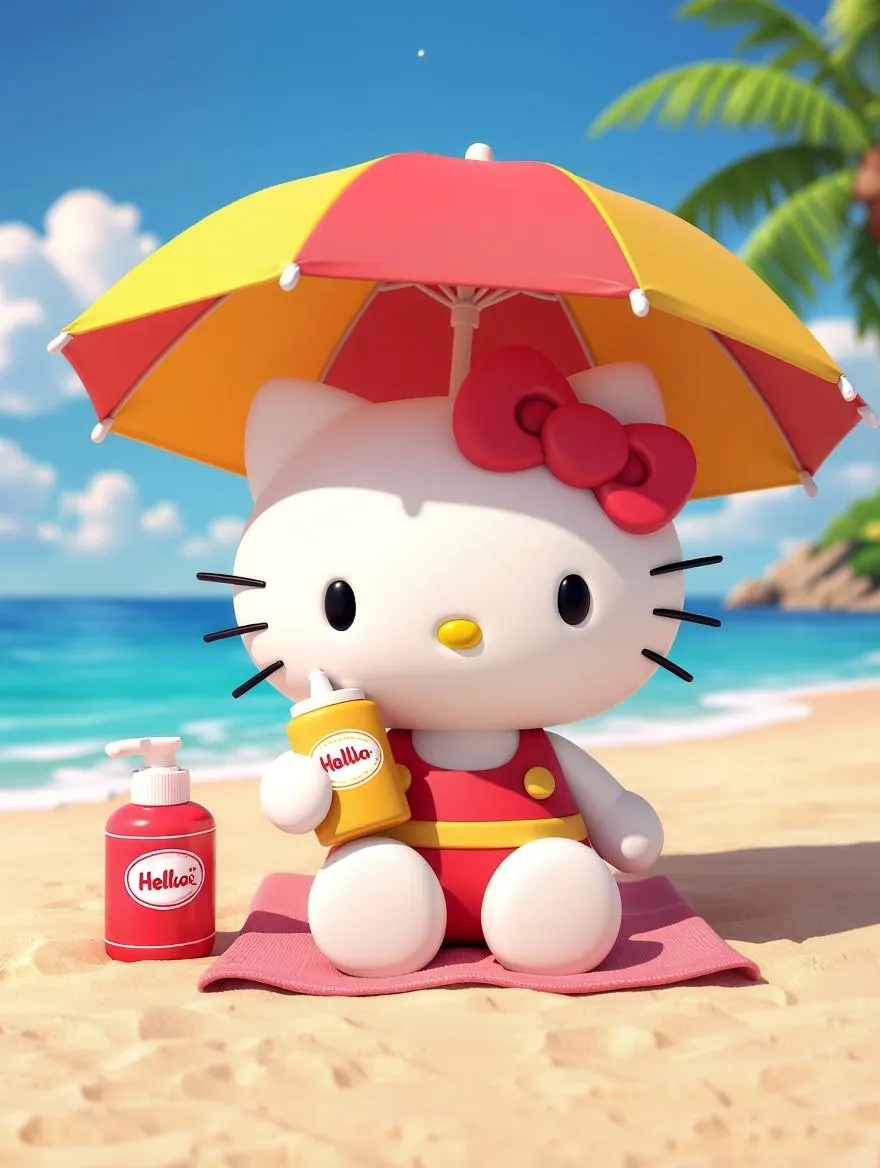 hellokitty在海边沙滩,坐在遮阳伞下,拿着防晒霜。立体感,可爱风。
