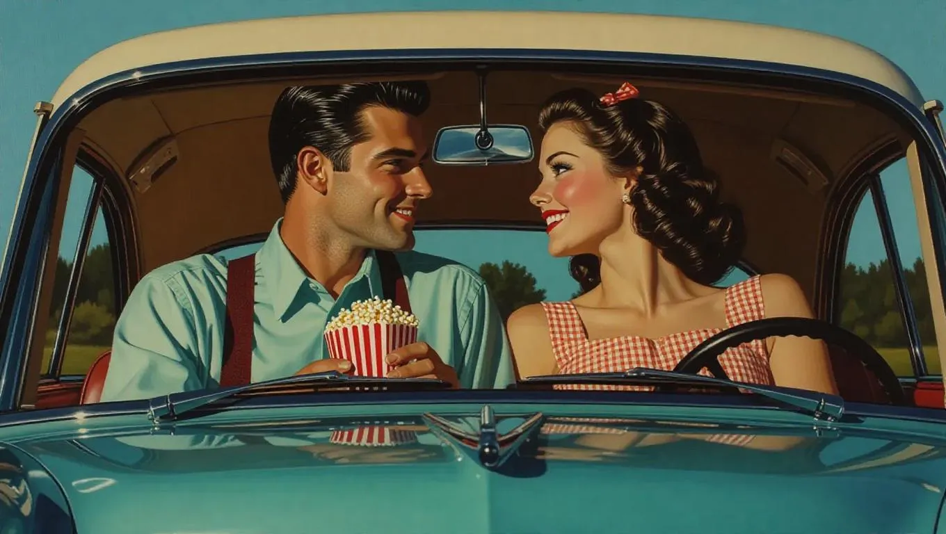 Create a nostalgic 1950s drive-in movie scene with AI-generated vintage painting effects. Depict a retro couple in a classic car, dressed in period attire, sharing popcorn under soft lighting. Rich warm tones, detailed textures, and cinematic ambiance evoke a romantic movie poster aesthetic. Transform prompts into professional-grade visual content with Vivago.ai's AI image generation tools.