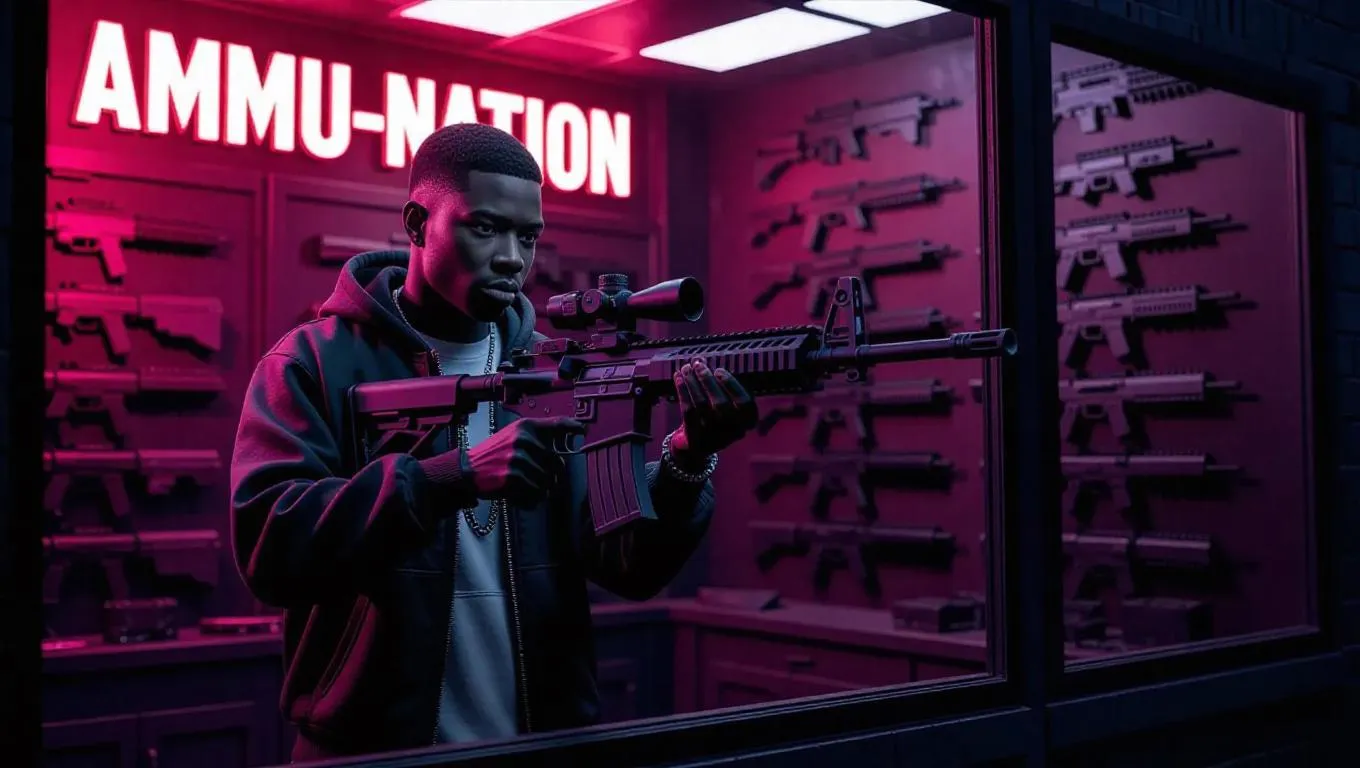 A young Black gangster, exuding confidence and street smarts, examines a high-powered rifle in a gritty GTA-style gun shop. The shop's window and signage prominently display "Ammu-Nation" in bold, neon letters, casting a neon glow over the scene. The interior is dimly lit, with rows of weapons and tactical gear lining the walls.