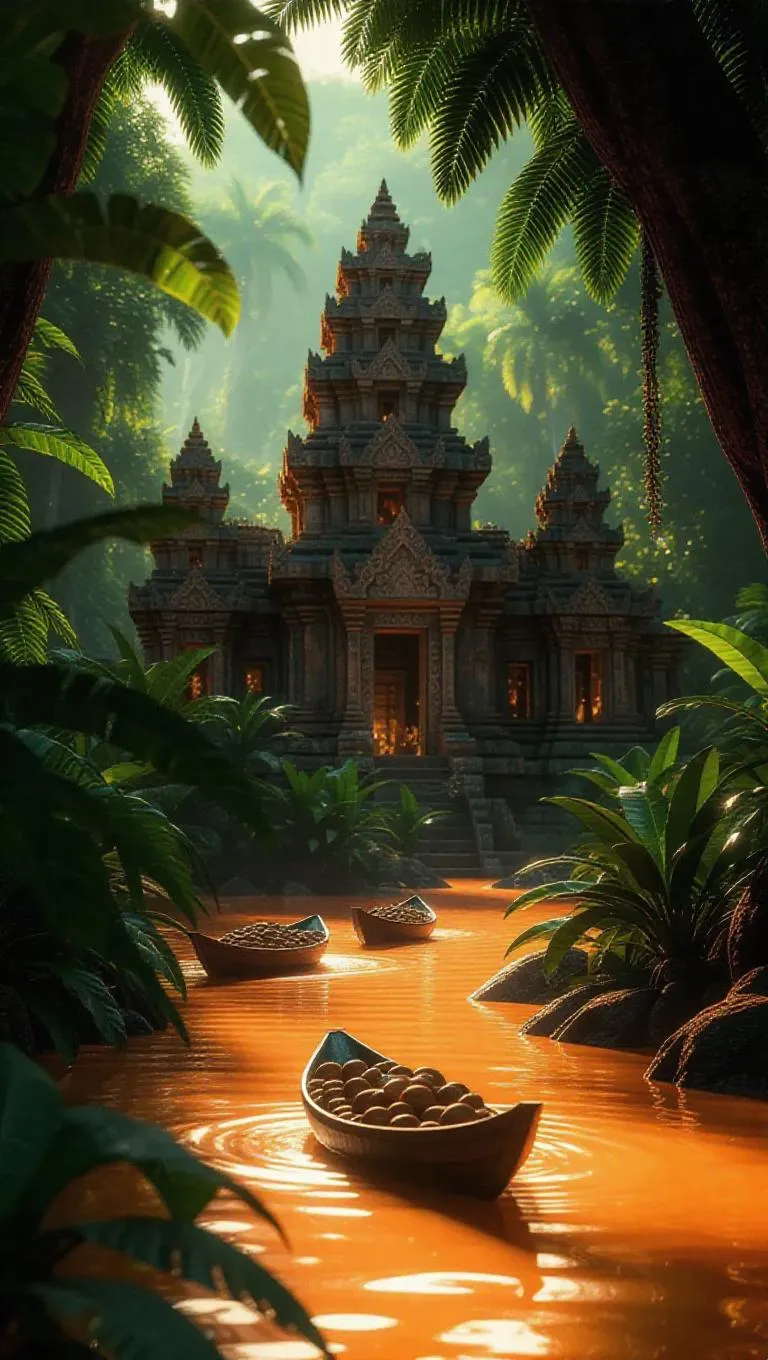 Deep in a lush tropical jungle of colossal mango trees, ancient temples rise, constructed from smooth, golden mango blocks that glow with radiant heat. Sticky rivers of pulpy gold meander through the landscape, while ethereal spirits drift by in dragonfruit-shaped canoes, their laughter echoing like a gentle breeze through the dense foliage.