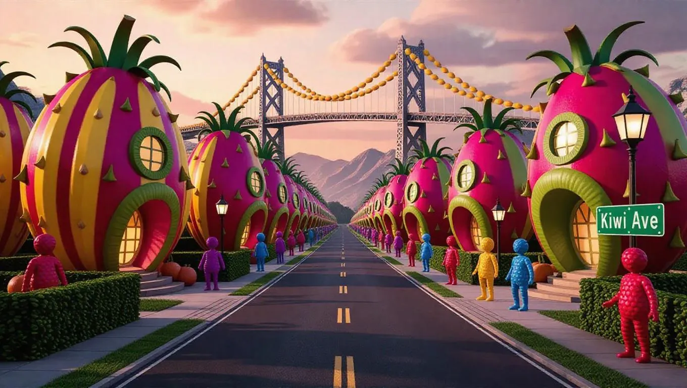 Create a whimsical fruit city with AI-generated ethereal shelters, banana street lanterns, and grapevine hedges. Craft realistic kiwi bridges, dragon fruit windows, and a vibrant "Kiwi Ave" sign. Transform prompts into dreamy visuals using vivago.ai's AI image generator for surreal, fruit-inspired towns and imaginative details like cantaloupe houses or tomato-roofed cottages.