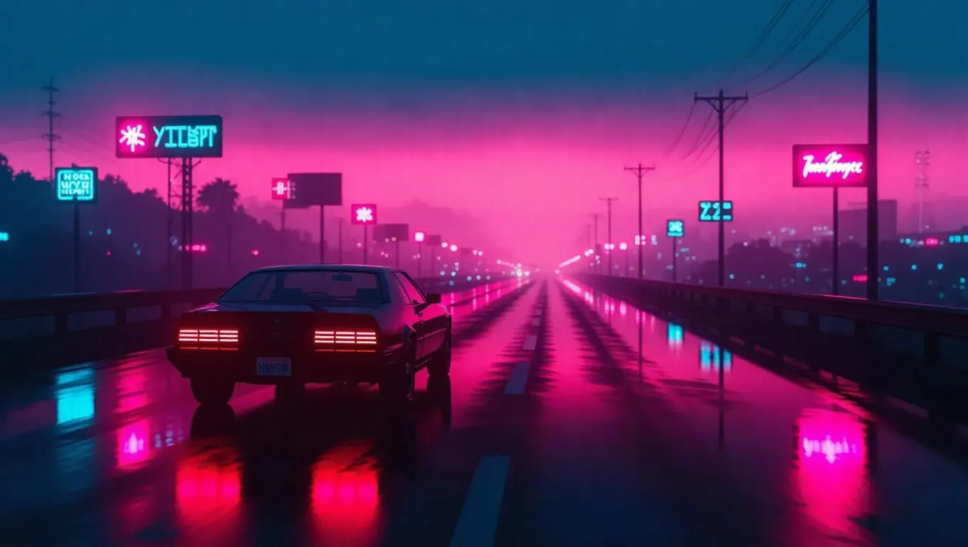 A sleek, minimalist bird in deep navy and charcoal perches elegantly on a tall, sinuous plant with vivid pink-red stems that arc like calligraphic strokes. The bird’s streamlined form, with a short beak and long flowing tail, balances delicately, its sharp silhouette set against a surreal gradient backdrop of violet, plum, and twilight indigo. Soft glows edge the plant and bird, hinting at ambient fantasy light. The clean, expressive composition evokes a dreamlike stillness, fusing contemporary nature minimalism with a surreal atmosphere.