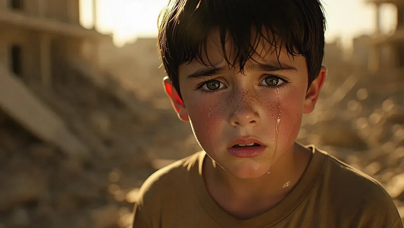 A young boy, tears streaming down his face, gazing intensely with a sorrowful expression, his eyes reflecting the trauma of war, crying uncontrollably, standing amidst a backdrop of utter devastation, with ruined buildings, rubble, and debris scattered everywhere, in a hyper-realistic, cinematic style, shot with a 50mm f/1.4 lens on a full-frame camera, at a low angle, with a shallow depth of field, warm, golden light casting a sense of desperation, and accentuating the textures of the destruction, the boy's face in sharp focus.