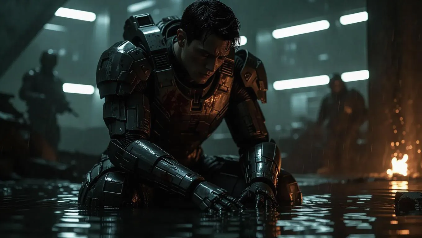 Generate a haunting cinematic scene of David Martinez's final moments with AI. Muted tones, dramatic lighting, and cracked armor highlight his emotional struggle. Cybernetic eye flickers with Lucy's reflection amid rain-soaked ruins, destroyed enemies, and collapsing structures. Perfect for AI-powered visual storytelling, blending realism, emotional depth, and professional-grade effects.