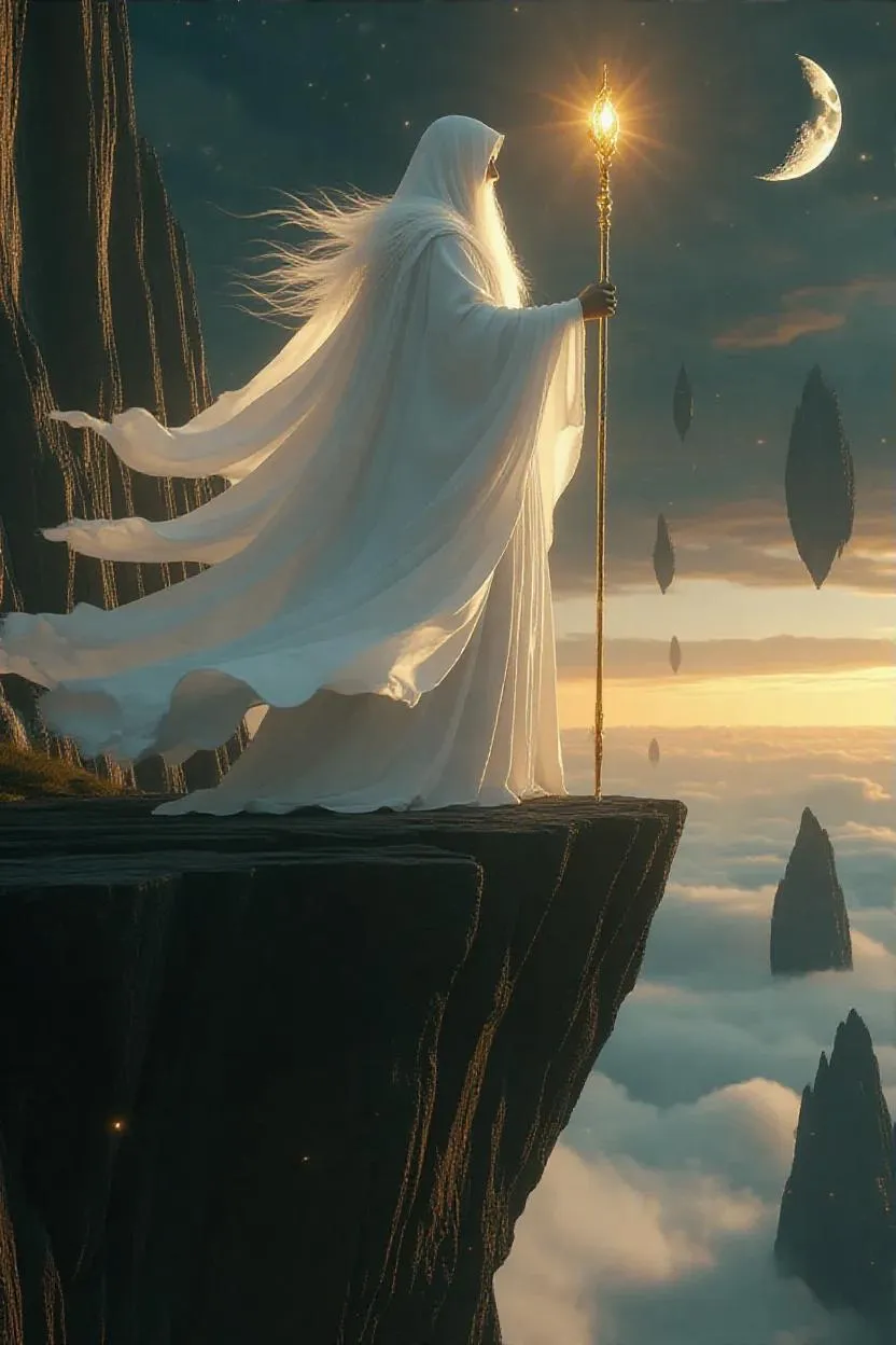 Create a cinematic high-fantasy scene featuring an ethereal wizard with flowing robes and glowing staff, overlooking floating islands under a multi-moon sky. Generate AI-powered magical landscapes and professional-grade visuals. Transform text into stunning imagery with Vivago.ai's advanced creative tools.
