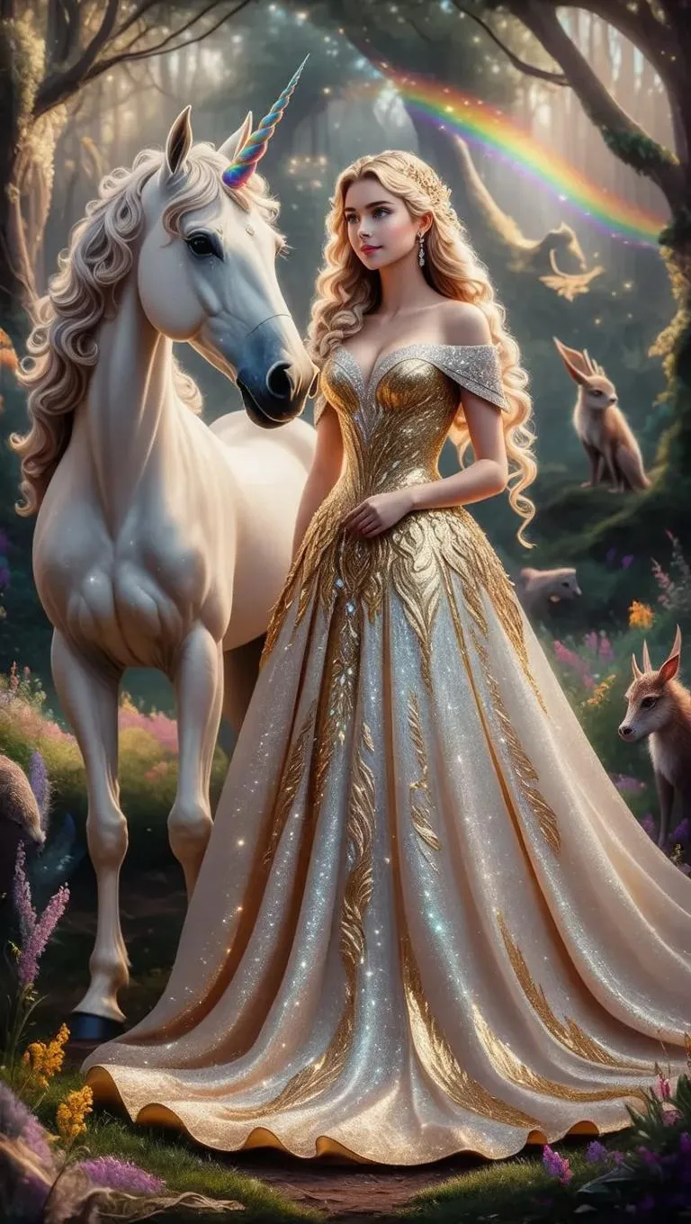 Create enchanting AI-generated art of a majestic unicorn with a rainbow horn and a regal woman in an intricate gold-silver gown amidst a magical forest teeming with mystical creatures. Elevate fantasy visuals with Vivago.ai's advanced AI tools for stunning, ethereal imagery.
