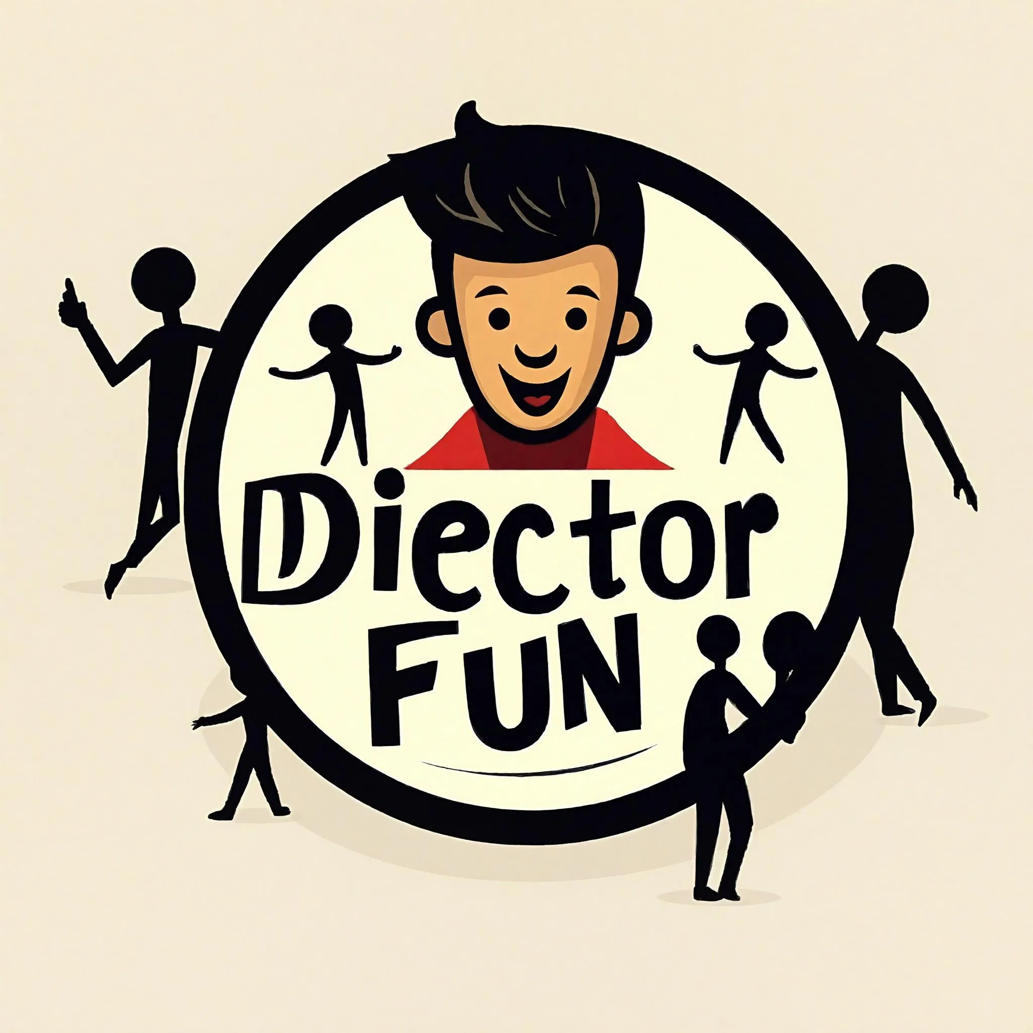 Create a vibrant AI-generated logo for "Director Fun" YouTube channel, featuring a round design with a dark black human figure contrasting against an ivory white background in illustration style. Enhance your brand with this playful yet professional AI-crafted emblem, optimized for visual impact and channel identity.