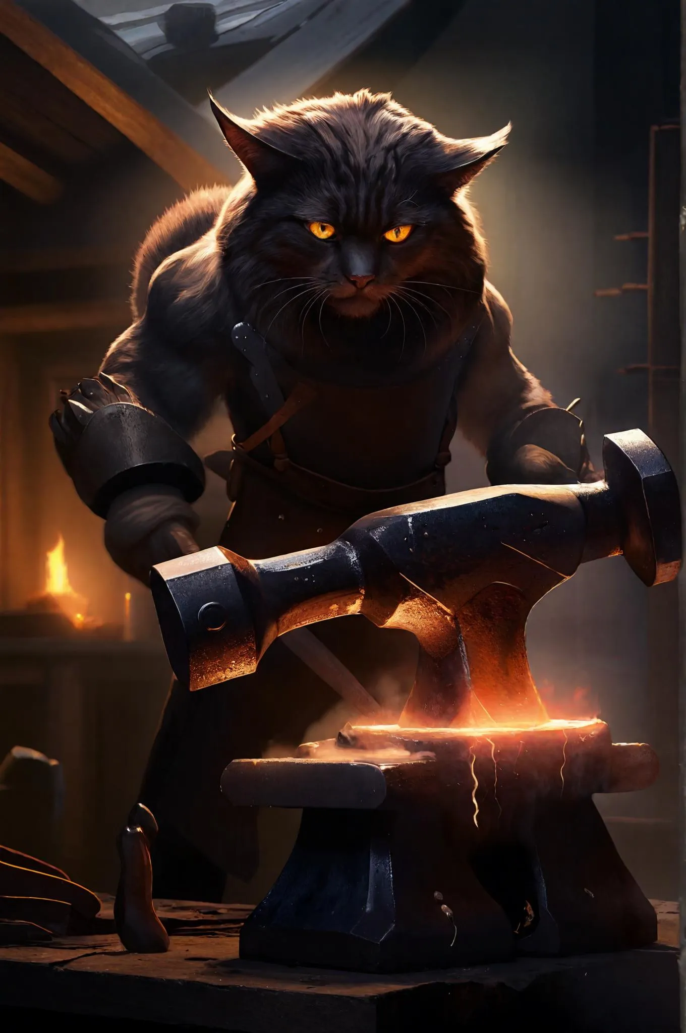 Generate a whimsical AI image of a blacksmith cat standing upright, wielding a hammer with an anvil nearby. Perfect for fantasy art, anthropomorphic animal designs, or creative storytelling. Powered by vivago.ai’s advanced AI image generator for crafting unique, professional-grade anthropomorphic characters and imaginative scenes.