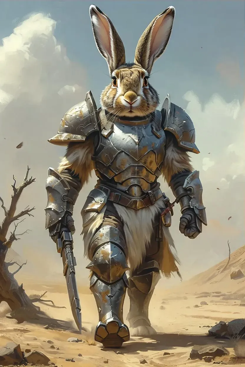 Generate a colossal armored anthropomorphic rabbit with intricate fur and metal textures in a barren post-apocalyptic landscape. AI-powered tool creates detailed stoic creatures, dead trees, and dusty terrains for professional sci-fi, fantasy, or concept art visuals.