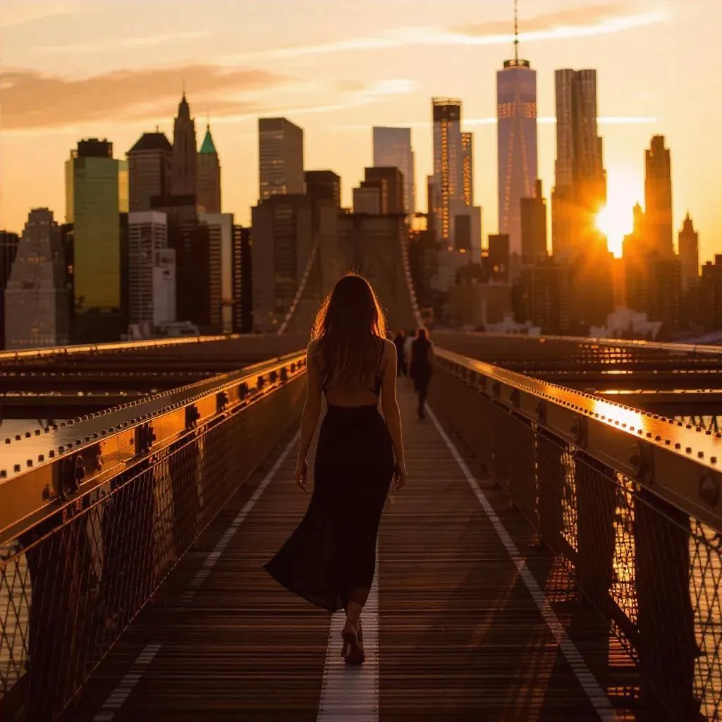 Capture Sofia's golden hour stroll across Brooklyn Bridge with AI-generated visuals. Transform text prompts into vivid New York sunset scenes, iconic architecture, and cinematic lighting effects using vivago.ai's AI-powered tools for professional-grade creative content. Elevate storytelling with precision and style.