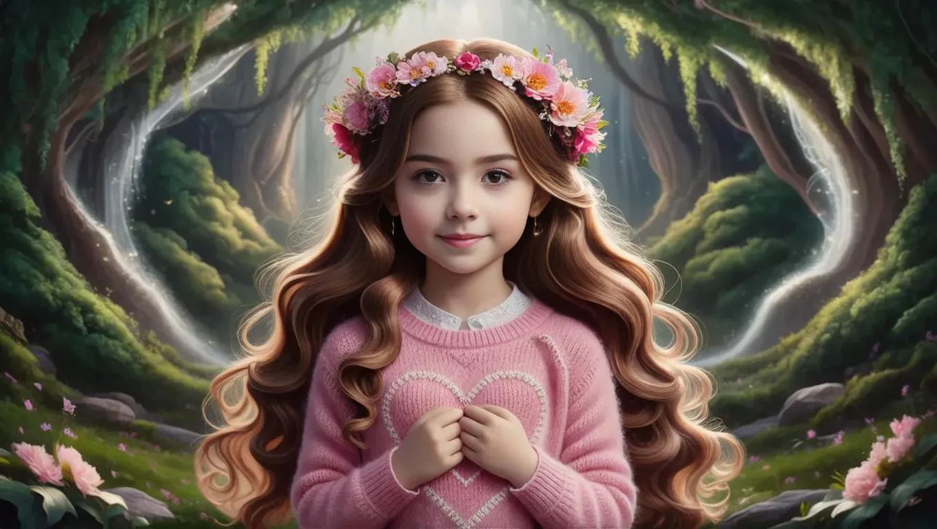 Create a captivating AI-generated portrait of an ethereal girl with long brown hair, a heart-emblazoned pink sweater, and a flower crown. Set in a lush emerald forest bathed in soft, magical light, this enchanting scene blends fantasy and realism. Perfect for fantasy visuals, digital art, and AI-generated imagery with Vivago.ai's creative tools.