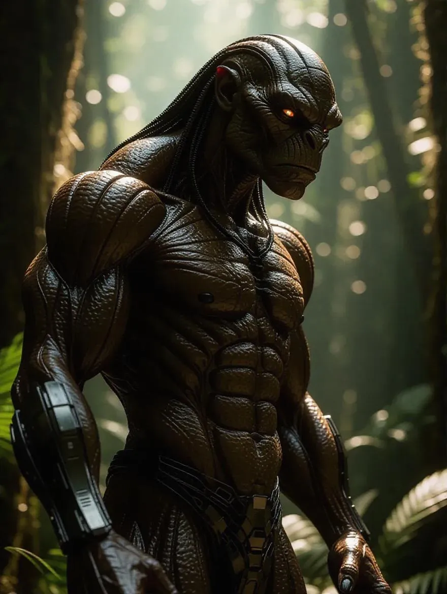 Generate AI art of a UV-resistant prehistoric humanoid with glowing eyes, futuristic tech clothing, and sharp claws in a dense Permian-era forest. VivaGo.ai transforms prompts into 8k visuals with precise anatomy, vibrant earthy tones, and immersive natural lighting. Create professional AI images blending primal power, sci-fi elements, and environmental storytelling effortlessly.