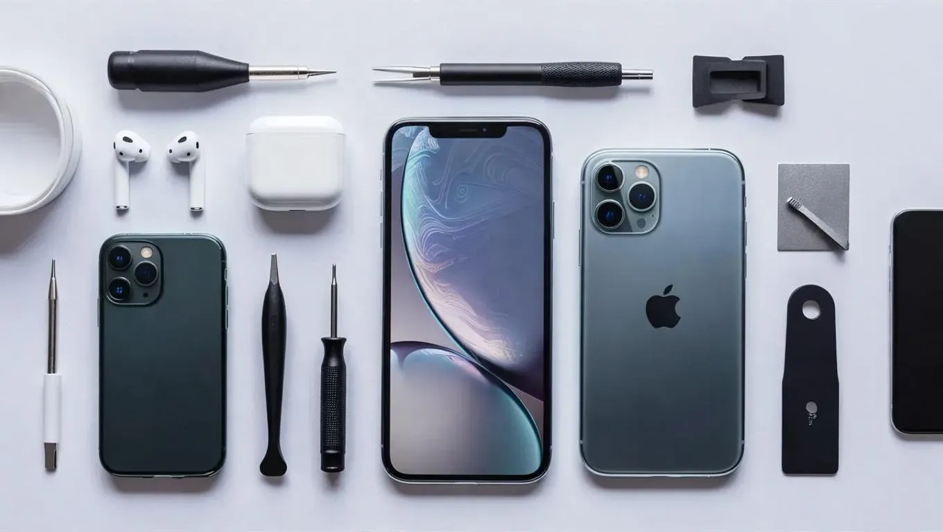 Create mobile accessory designs with this AI-generated wallpaper featuring iPhone, Samsung, AirPods, mobile cases, and repair tools on a clean white background. Perfect for tech enthusiasts, this minimalist design highlights essential gadgets and tools, ideal for showcasing your mobile setup or enhancing your digital workspace.
