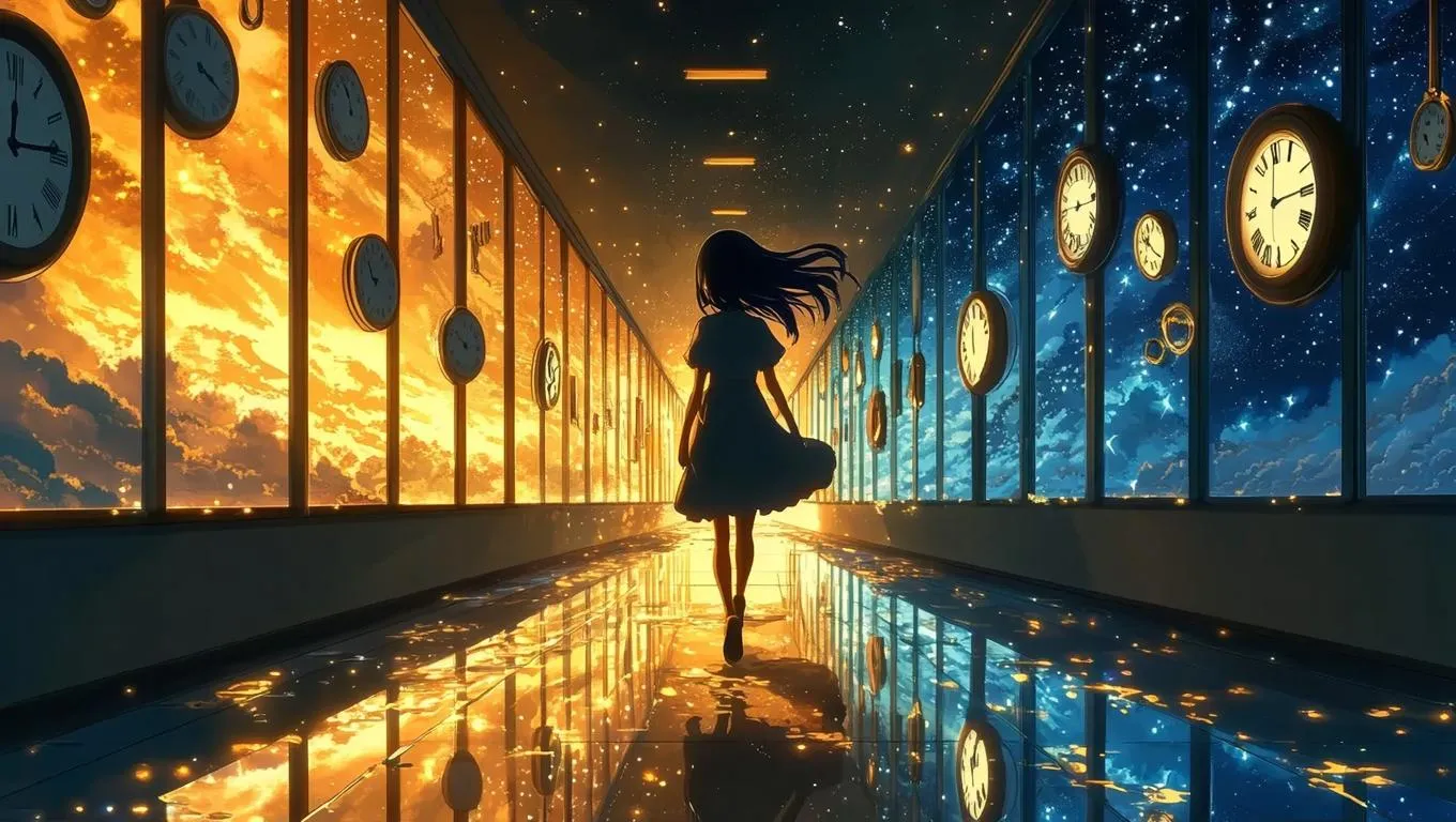 Transform text into surreal anime scenes with Vivago.ai's AI image generator. Craft cinematic visuals of a girl traversing a day-night hallway, walls lined with erratic clocks, her hair shifting hues. Achieve watercolor gradients, mirrored shadows, and precise surreal detail—ideal for creating liminal, otherworldly moments through AI-powered artistry.