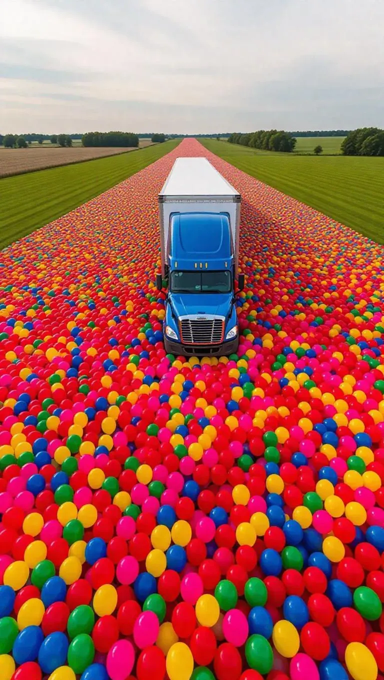 Stunning aerial view of a vibrant green field covered with thousands of bright red, yellow, blue, green, and pink balloons. A large blue semi-truck anchors the lively scene amid open farmland, distant trees, and cloudy skies. Perfect for AI image generation, blending whimsical color, rural charm, and festive energy with vivid daytime lighting. Ideal for creative visuals and dynamic landscape concepts.