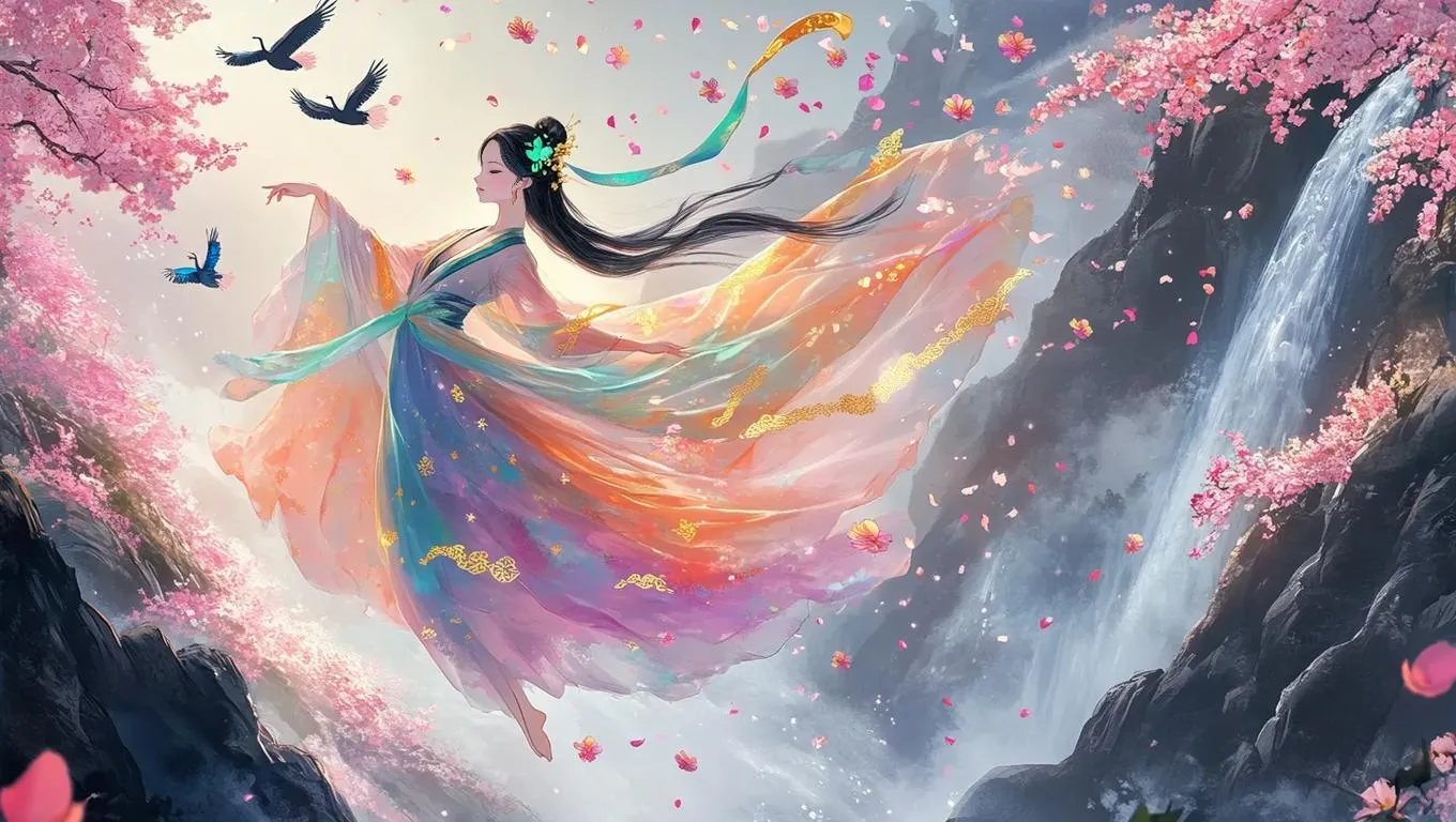 Create AI-generated celestial maiden art blending traditional Chinese fantasy with anime aesthetics. Ethereal scene features flowing gauze, golden clouds, swirling petals, soaring cranes, and misty peach blossom valleys. Inspired by Fog Hill of Five Elements and White Snake, this AI image generator merges ink-wash textures with dynamic anime linework for harmonious celestial motion and dreamlike landscapes.