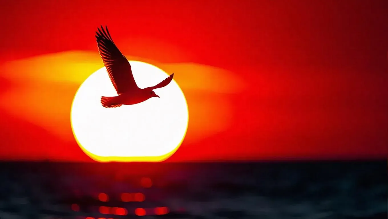 Dramatic AI-generated sunset silhouette of a soaring bird against vibrant orange-red skies and reflective ocean. Capture freedom and tranquility with AI image tools for striking nature scenes, vivid color contrasts, and serene horizon compositions. Perfect for evocative visual storytelling in professional-grade, fiery sunset imagery.