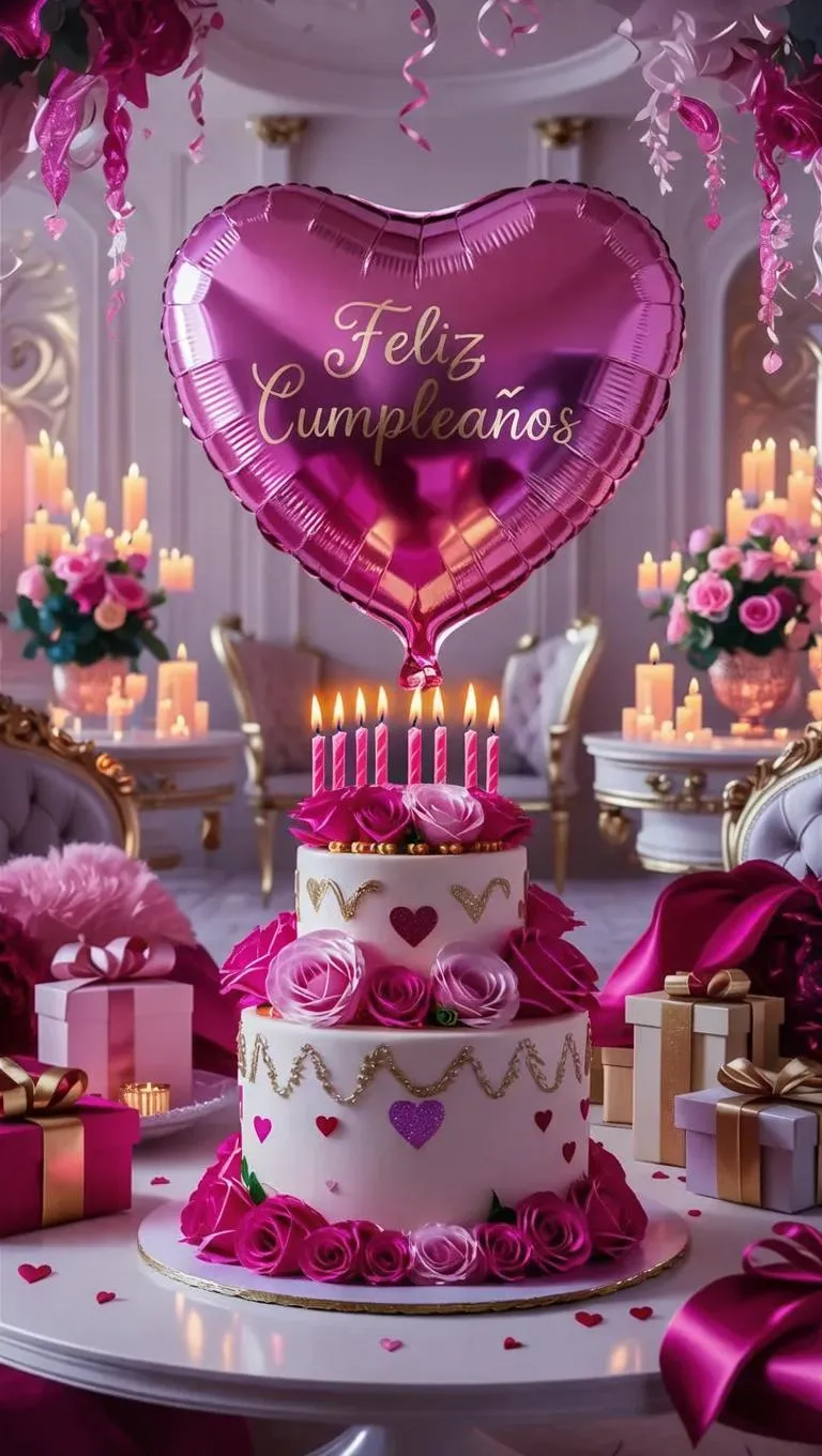 Create vibrant AI-generated 3D festive scenes with heart-shaped balloons, luxurious "Feliz Cumpleaños" cards, and decorative cakes adorned with fuchsia roses. Transform text prompts into lavish birthday visuals featuring ornate backgrounds, romantic accessories, and vibrant colors using advanced AI tools.