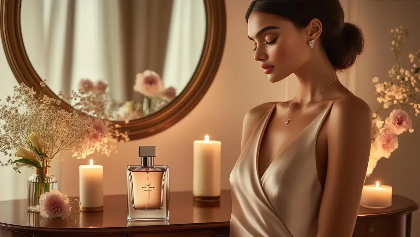 Create a luxurious AI-generated image of a sophisticated woman in a silky evening dress, spraying niche perfume in an elegant vintage-inspired room. Vivago.ai crafts realistic visuals with cinematic lighting, split-complementary composition, and lavish details like wooden vanities, delicate flowers, and minimalist luxury accents. Elevate your creative projects with AI-powered refinement.