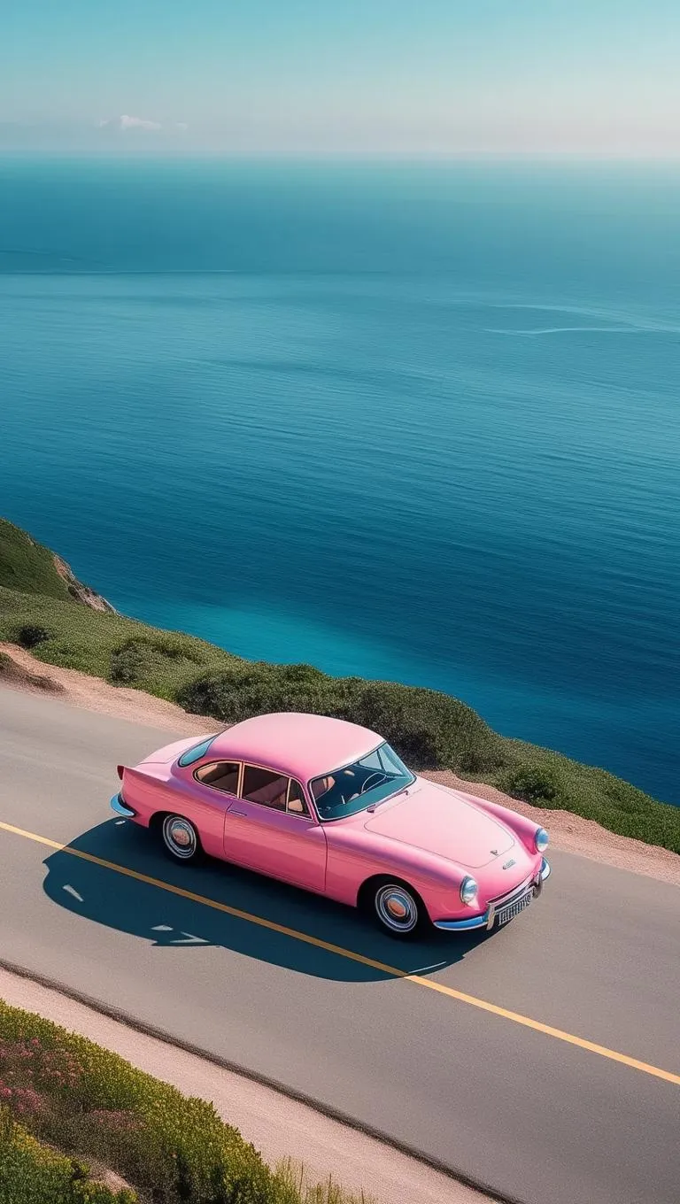 Create stunning AI-generated visuals with vivago.ai. A vibrant pink car glides along a winding coastal road beside a shimmering ocean under clear skies. Experience modern elegance fused with serene nature in this minimalist, license plate-free design. Perfect for creative projects, ads, or digital art. Transform ideas into professional visuals effortlessly using AI-powered image generation tools.