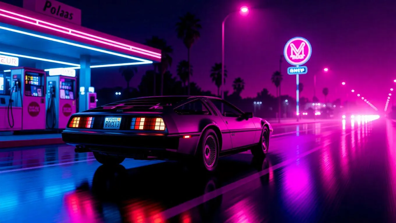 Step into an 80's neon-drenched synthwave universe with this ultra-HD HDR wallpaper. Featuring a retro car, glowing gas station, and grainy cityscape, it captures the nostalgic vibe of vintage sci-fi. Perfect for AI-generated art lovers seeking 16k-resolution visuals blending film grain textures, retro-futuristic aesthetics, and vibrant Synthwave nostalgia.