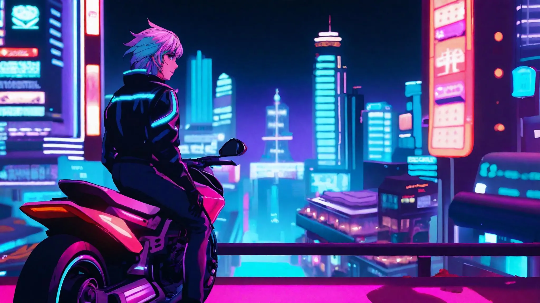 Generate AI-powered pixel art game scenes with neon cyberpunk aesthetics. Explore open-world motorcycle adventures in Cyan, Violet, Azure, and Soft Pink anime-style landscapes. Vivago.ai blends retro gaming visuals with AI effects for vibrant Neoncity exploration and Cyberspace ambiance. Create dynamic, neon-lit scenes effortlessly.