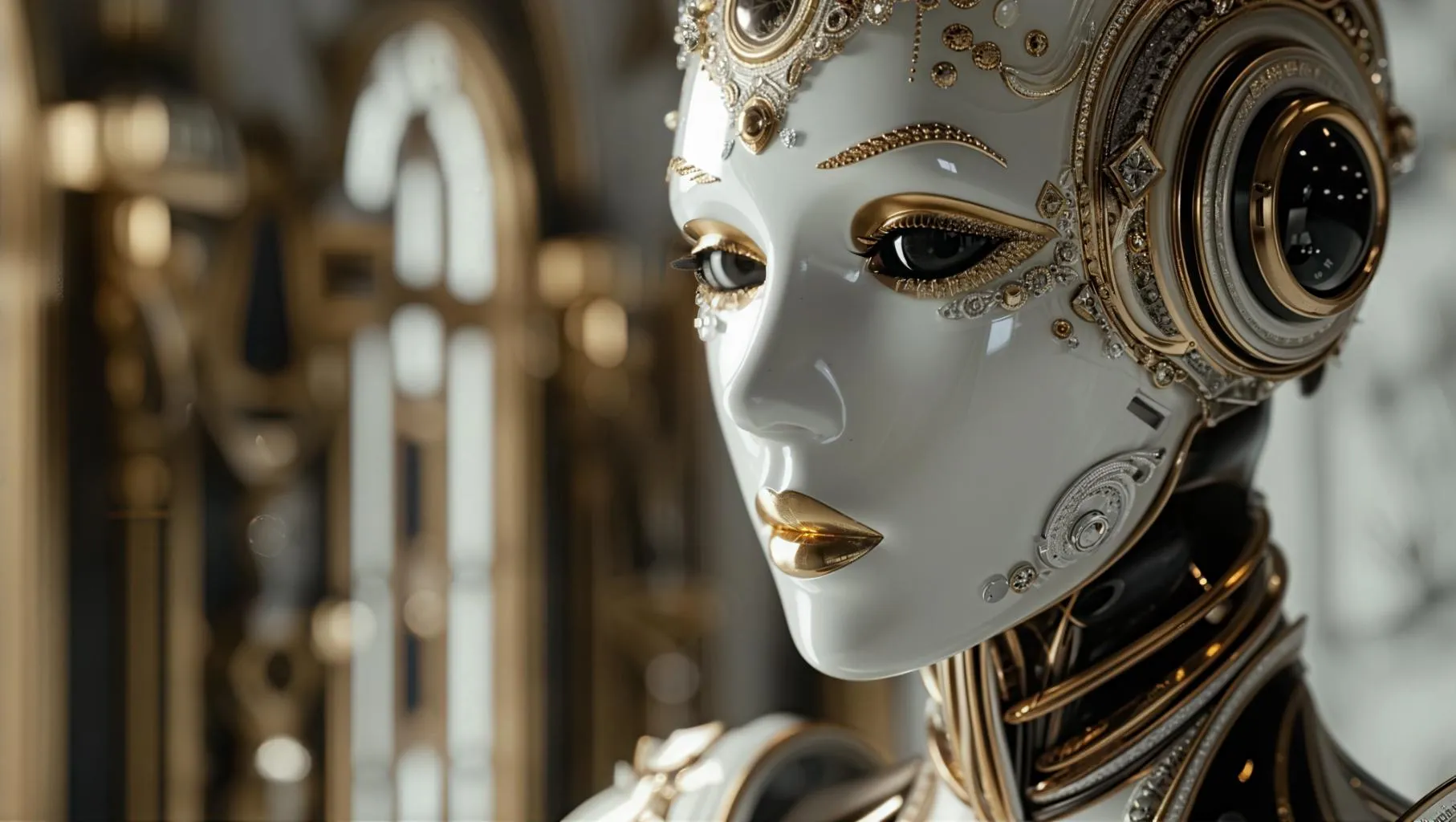 Explore a sci-fi dystopian world with a rococo-inspired mannequin adorned in elegant ornaments and obsidian eye. Featuring intricate robotic motifs, light white and gold hues, 8K resolution close-up, rendered in Unreal Engine for professional-grade AI visuals. Perfect for AI-generated art blending dystopian futurism with baroque elegance.