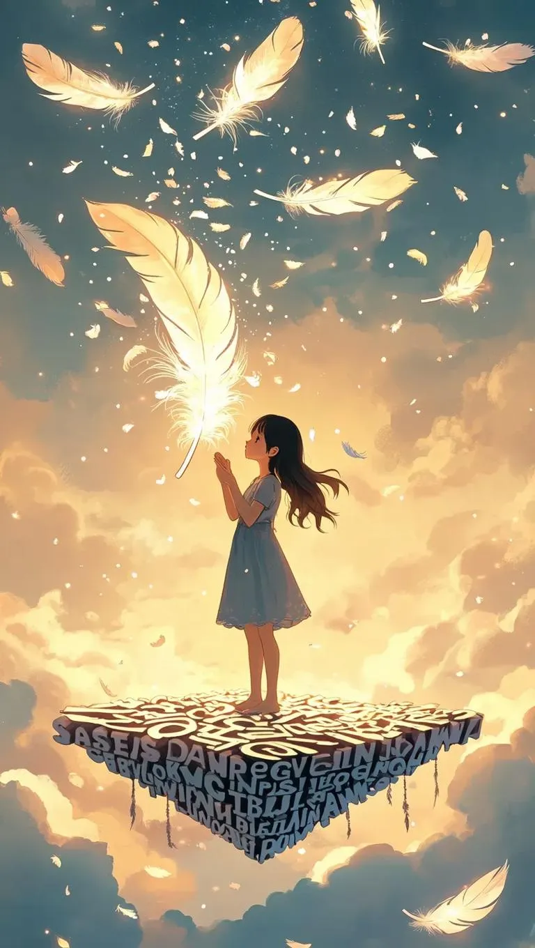 Transform text prompts into ethereal anime scenes with VivaGo.ai's AI image generator. Depict a girl on a floating platform of letters and feathers, surrounded by glowing memory-filled feathers against a twilight sky. Emotional storytelling meets delicate watercolor textures and anime aesthetics—create dreamlike visuals effortlessly.