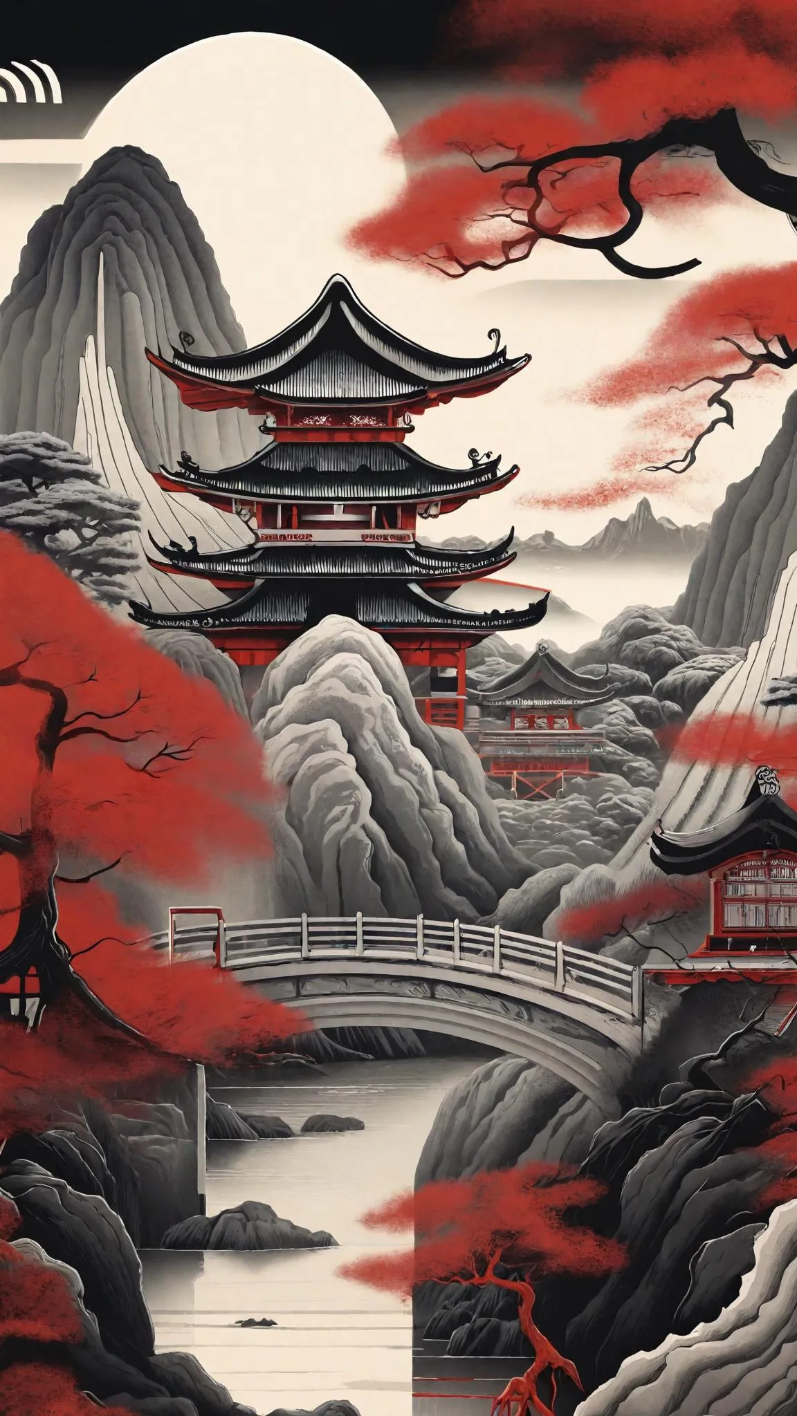 Psychedelic, vivid red, black, grays, and whites, intricate Japan ornate topography, featuring old scripts and detailed pictures of ancient Japanese swordsmiths, blending traditional art with surreal patterns.