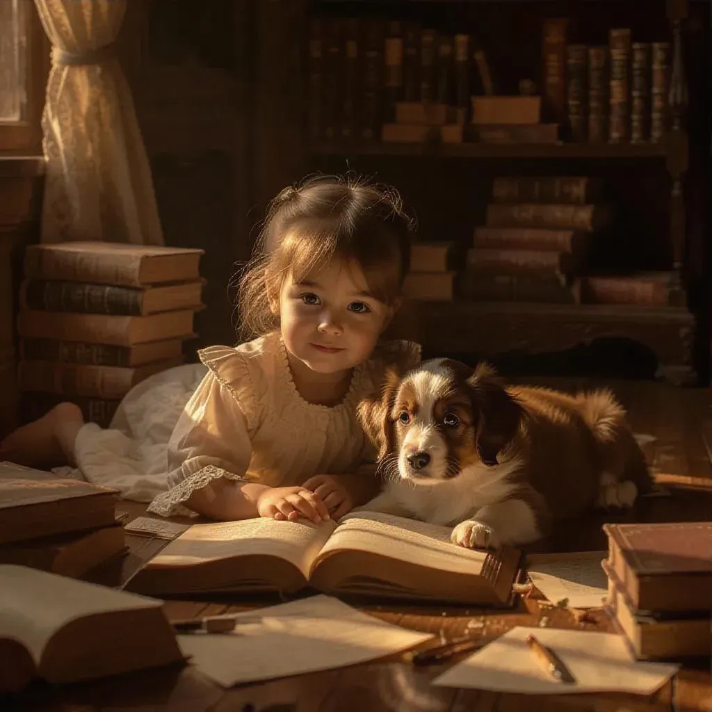 Create a heartwarming AI-generated scene of a girl and puppy in an 18th-19th century classical painting-style bedroom, surrounded by books, paper, and pens. Capture vintage charm and cozy ambiance with vivago.ai's tools for professional-grade AI art and effects. Transform text into timeless visuals with precision.