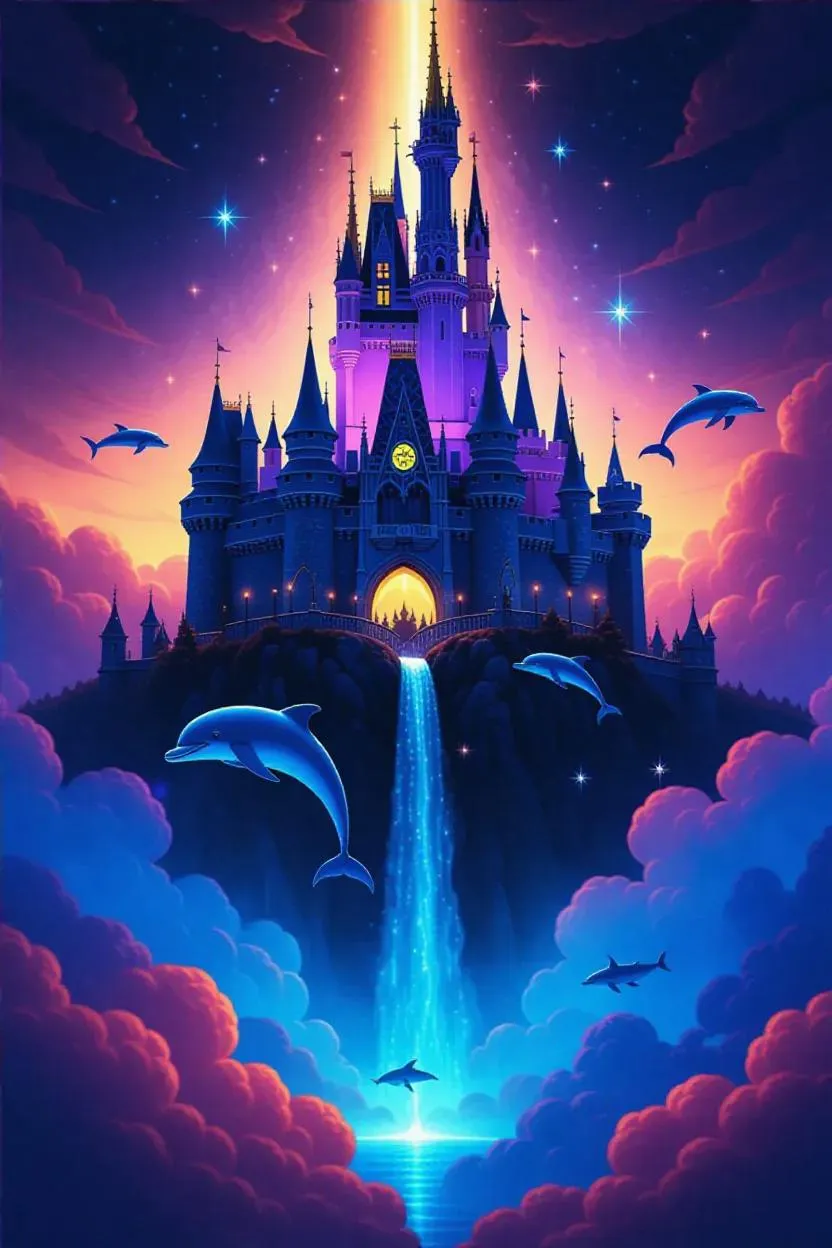 Craft enchanting AI visuals with vivago.ai: a princess' silhouette, floating castle, cascading waterfall, and cotton candy clouds. Add shimmering stars, glitter, and mystical airborne dolphins, whales, and fish for magical wonder. Transform prompts into professional-grade fantasy scenes using AI image generation and effects.