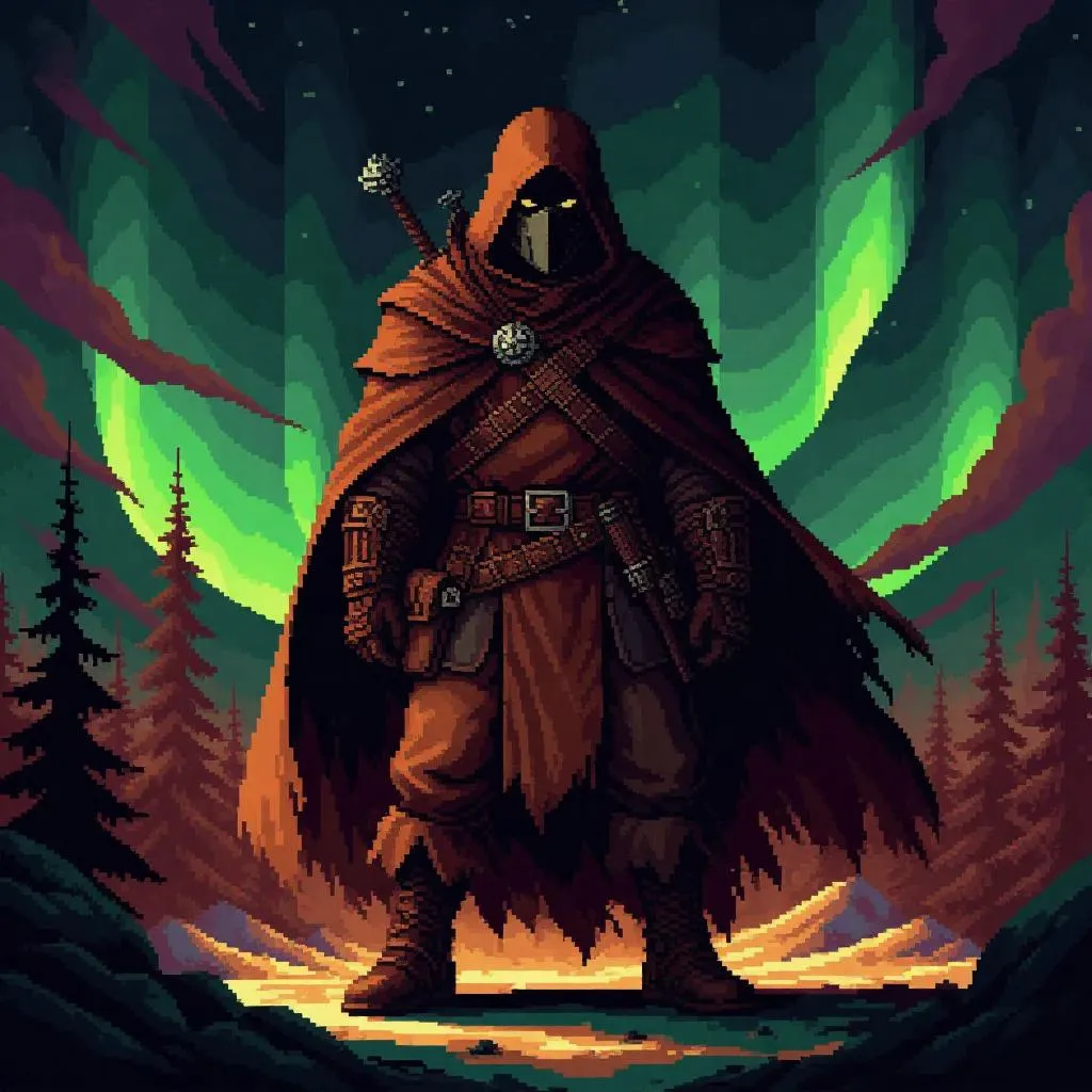 Transform text into retro gaming art with Vivago.ai's Pixelated Aurora effect. Generate AI-powered bandit characters in rich brown-dark brown palettes, blending nostalgic pixel art with ethereal Aurora visuals. Ideal for indie game designers seeking vintage charm.